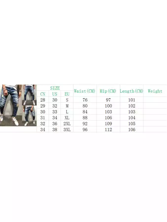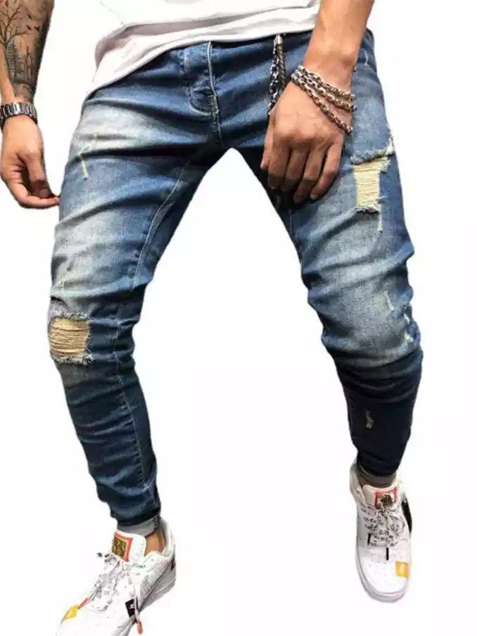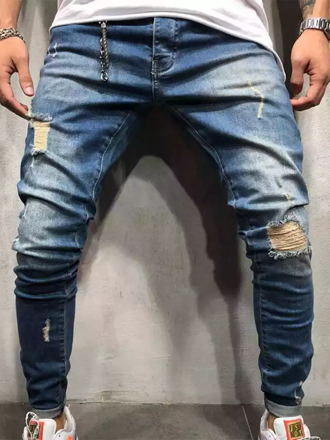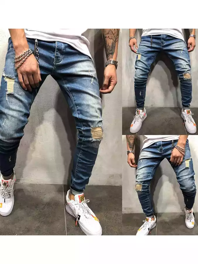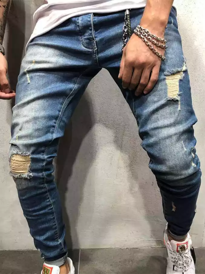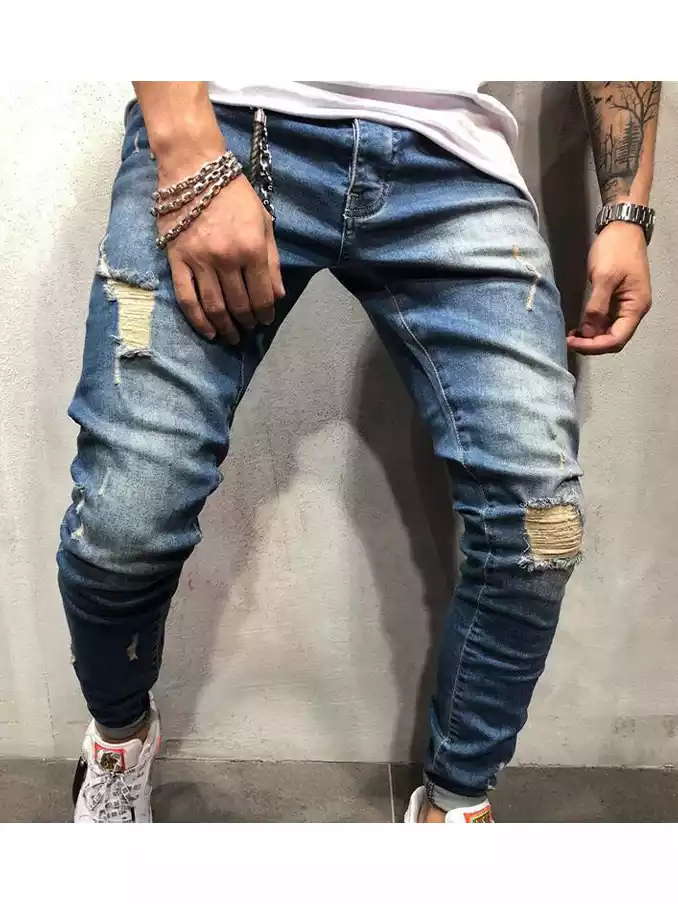 wholesale men's distressed ripped hole small leg jeans blue tight skinny denim pants straight wear