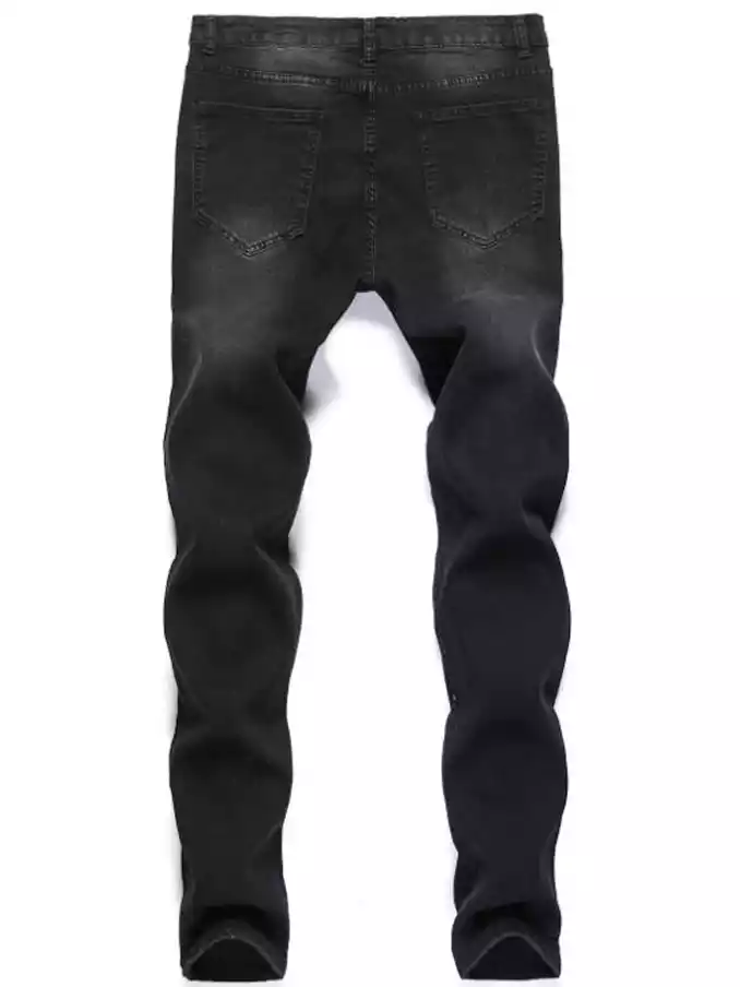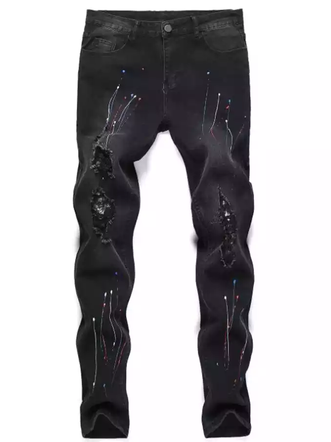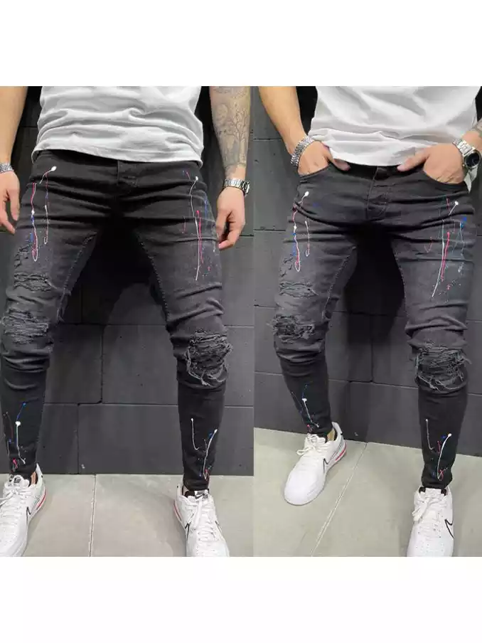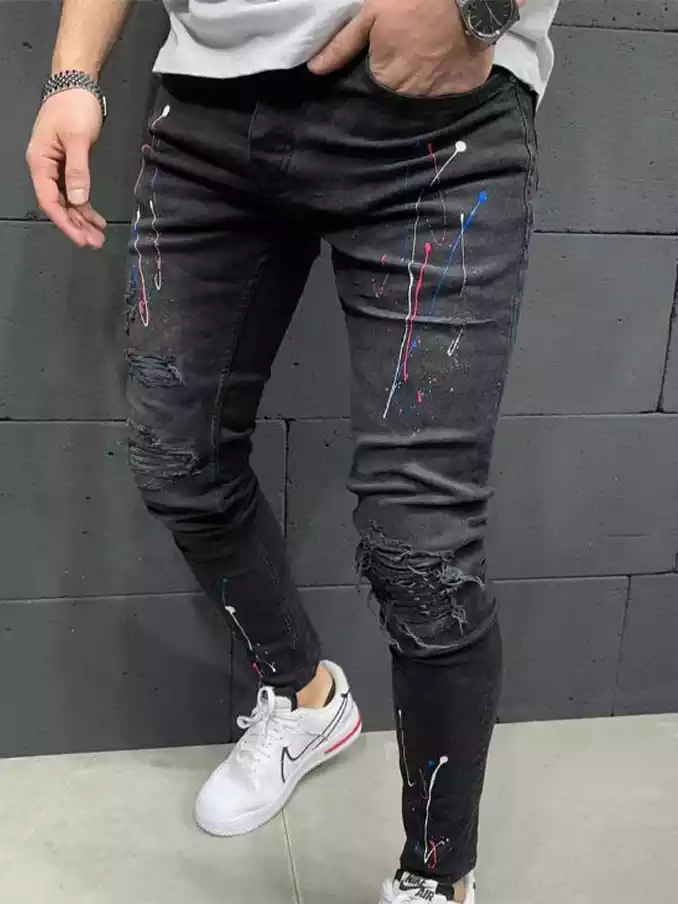 Men's distressed printed jean pant with spray paint stretch small leg jeans black streetwear