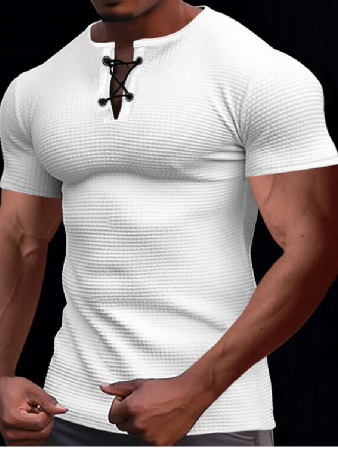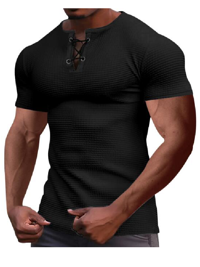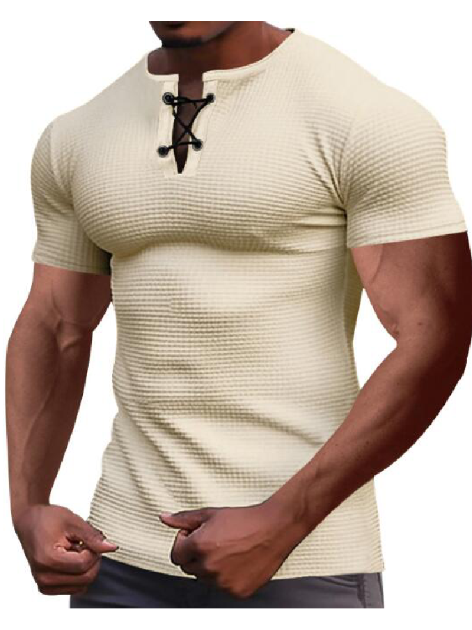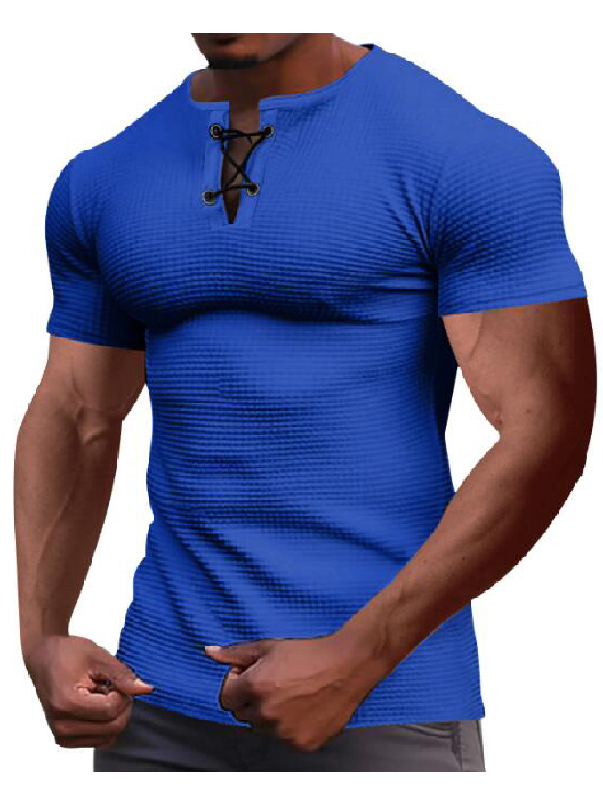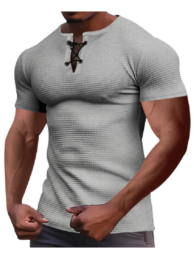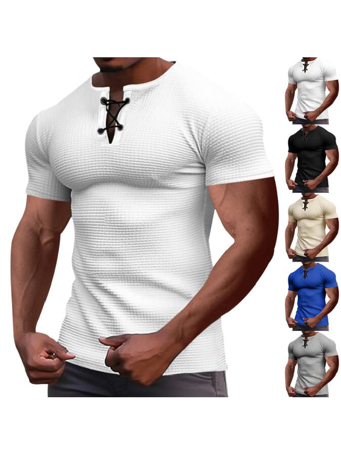 Summer sport casual slim fit breathable men's short sleeved T-shirt Waffle men's tied Henley shirt top