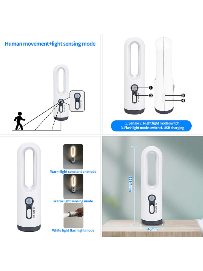 EDC Flashlight Motion Sensor 600mAh Battery USB Rechargeable 400 Lumens Torch Bedroom Working Read Reading Desk Light Table Lamp 10W