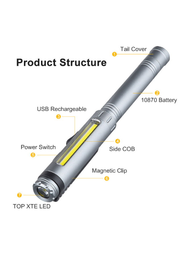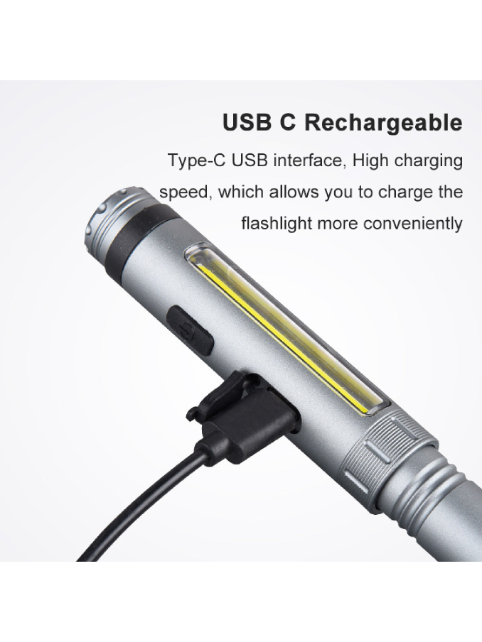 Flashlight Side COB Floodlight Penlight Magnetic Clip Torch USB Mini Pen Light