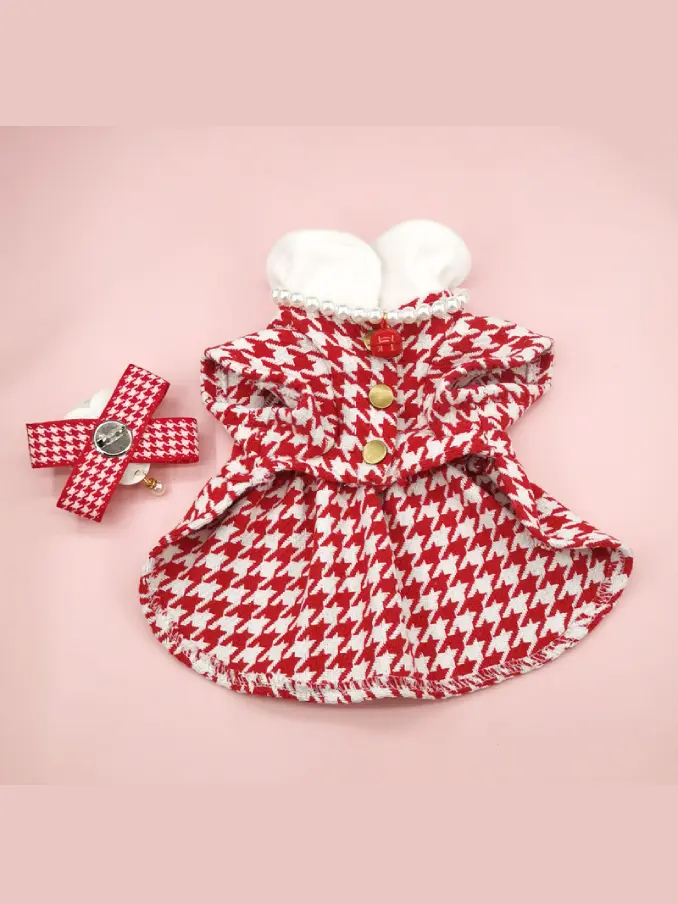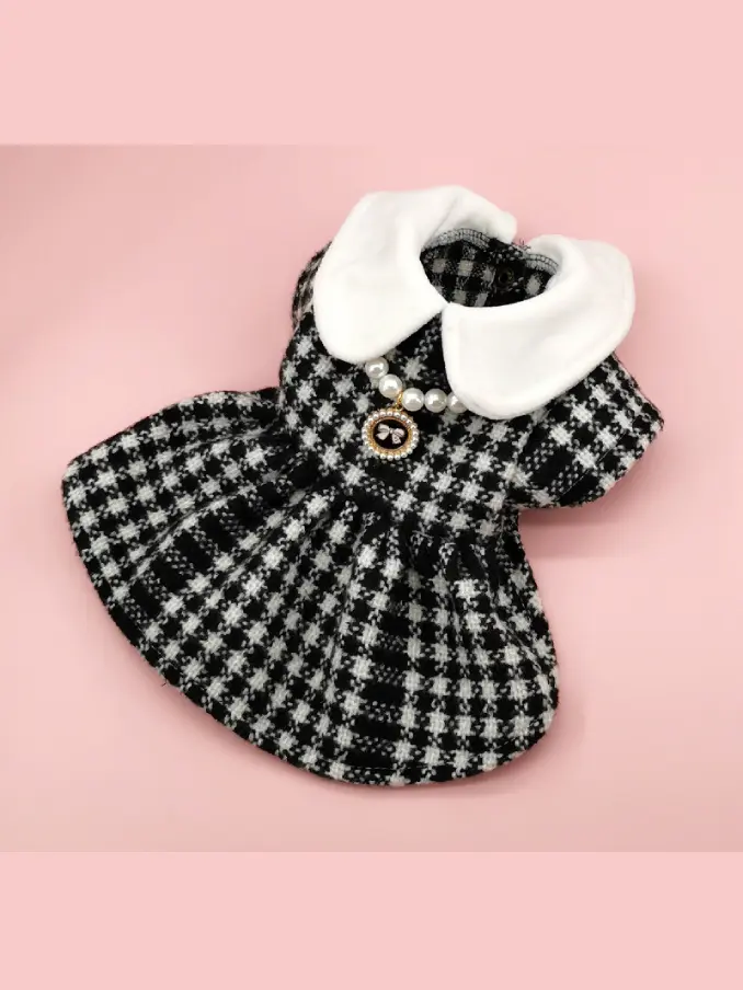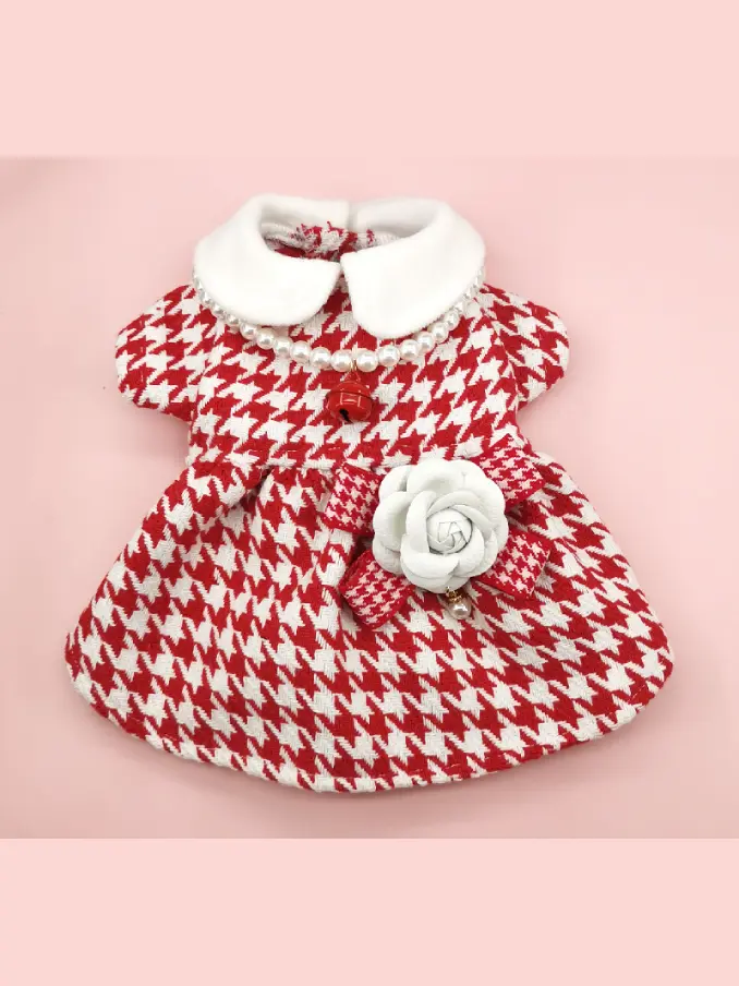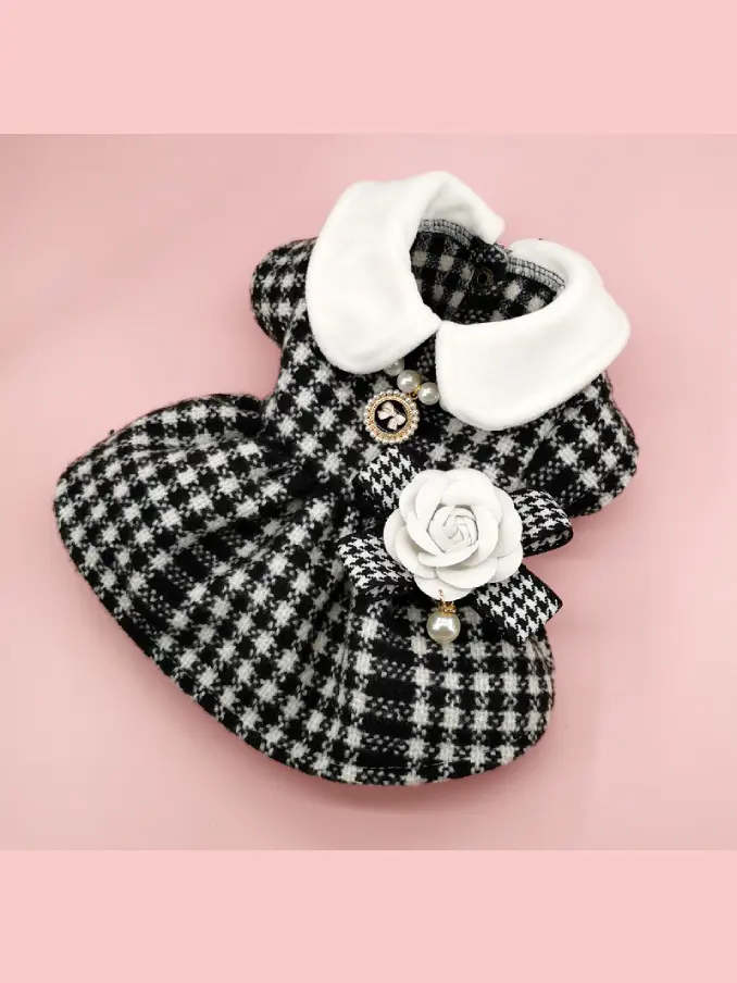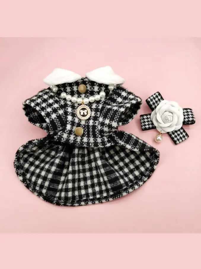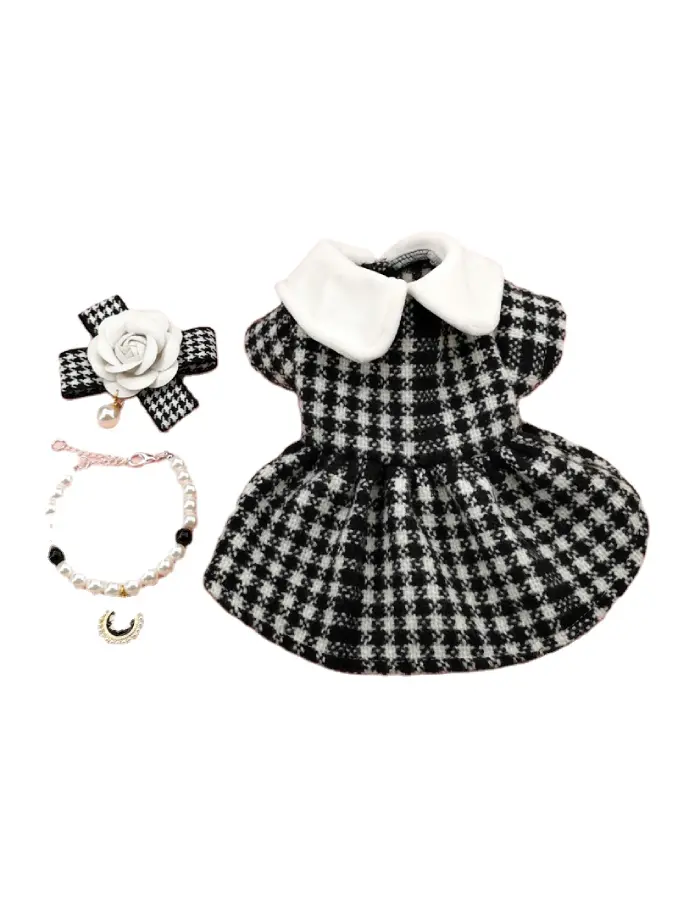 Teddy Schnauzer Plaid Print Dress Clothes Flower Necklace Accessories Winter Warm Fashion Cute