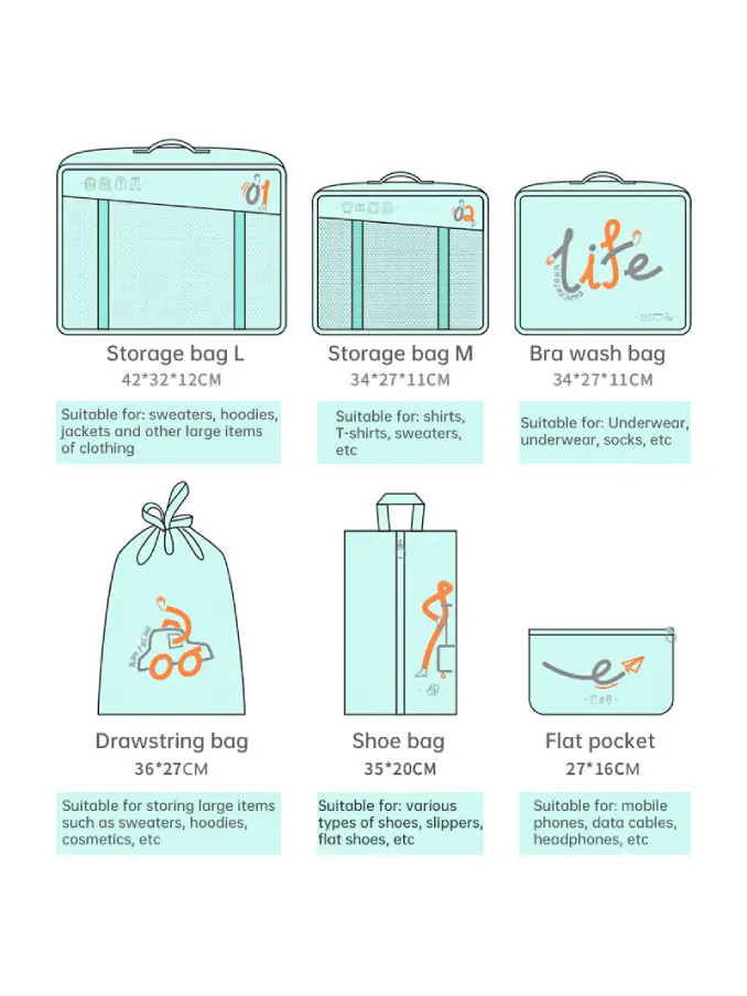 Make traveling a breeze with our Packing Cubes for Travel. This 6-piece set of lightweight and foldable suitcase organizers is designed to keep your belongings neatly sorted and easily accessible throughout your journey.