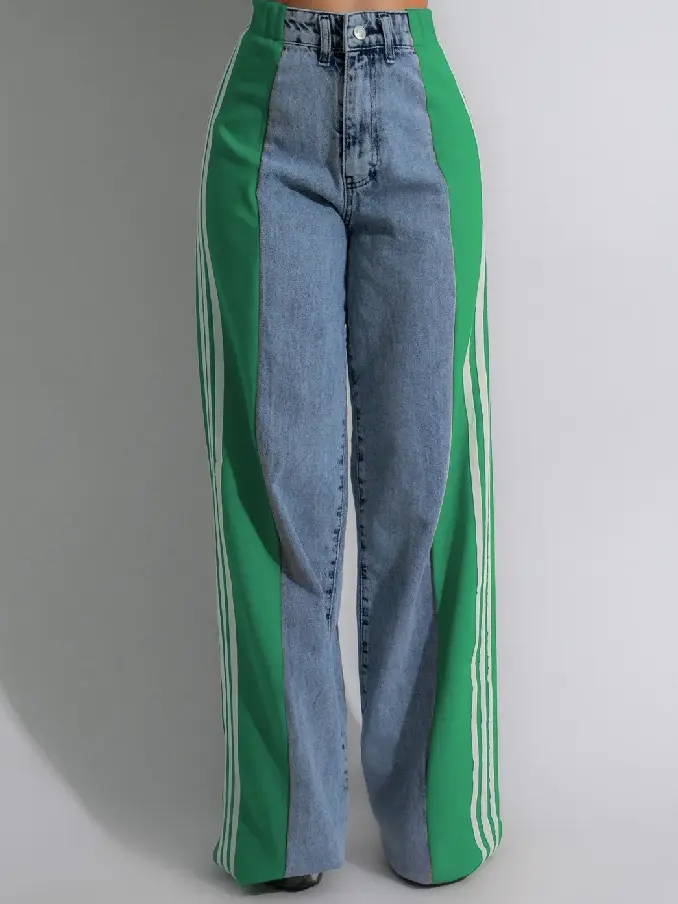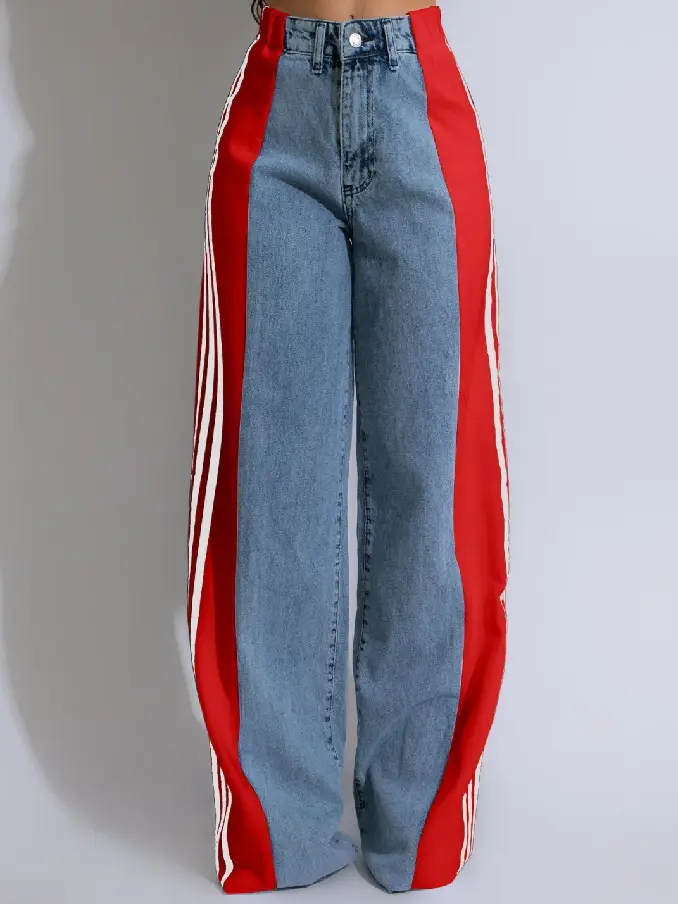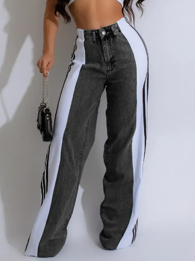 Stripe Splicing Jeans Denim High Waisted Button Straight Trousers