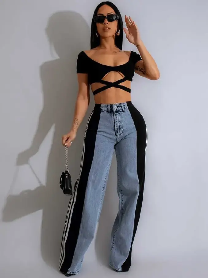 Elevate your denim collection with our Stripe Splicing Jeans Denim High Waisted Button Straight Trousers, a blend of modern style and classic comfort. These trousers are designed for the fashion-forward individual who appreciates unique details and impeccable craftsmanship.
