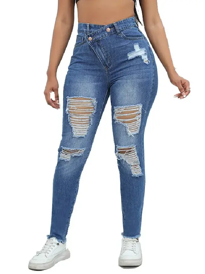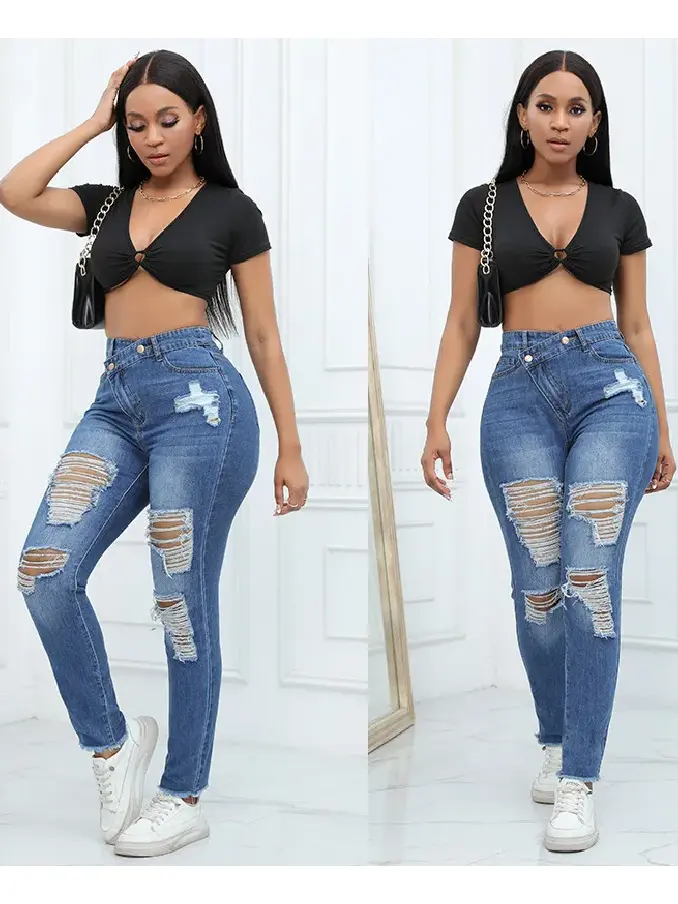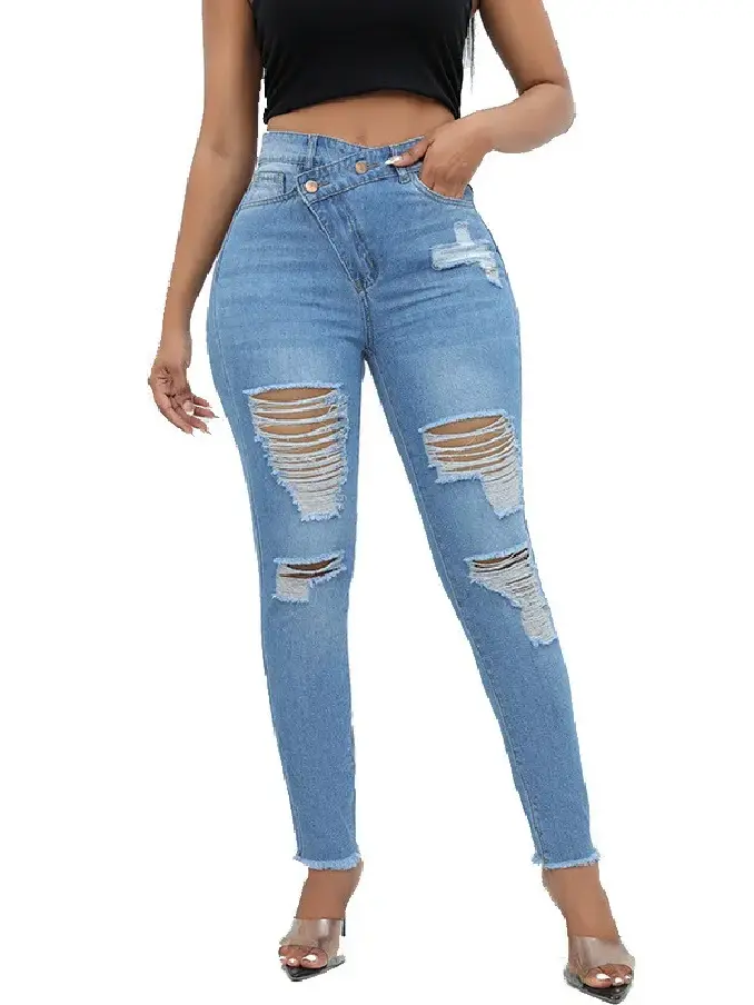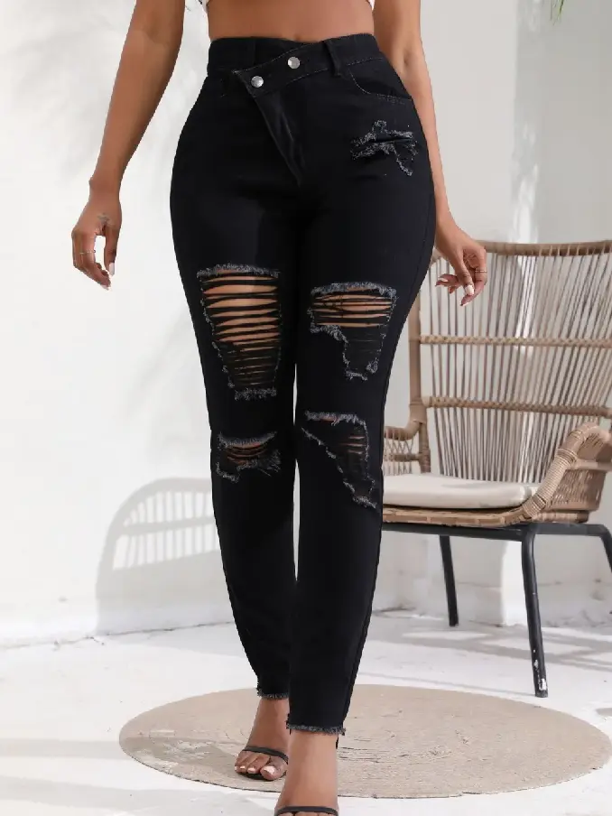Ripped Raw Hem Skinny Jeans, where edgy meets chic in the perfect blend of comfort and style. Crafted from premium denim, these jeans feature a contemporary skinny fit that hugs your curves while allowing freedom of movement.