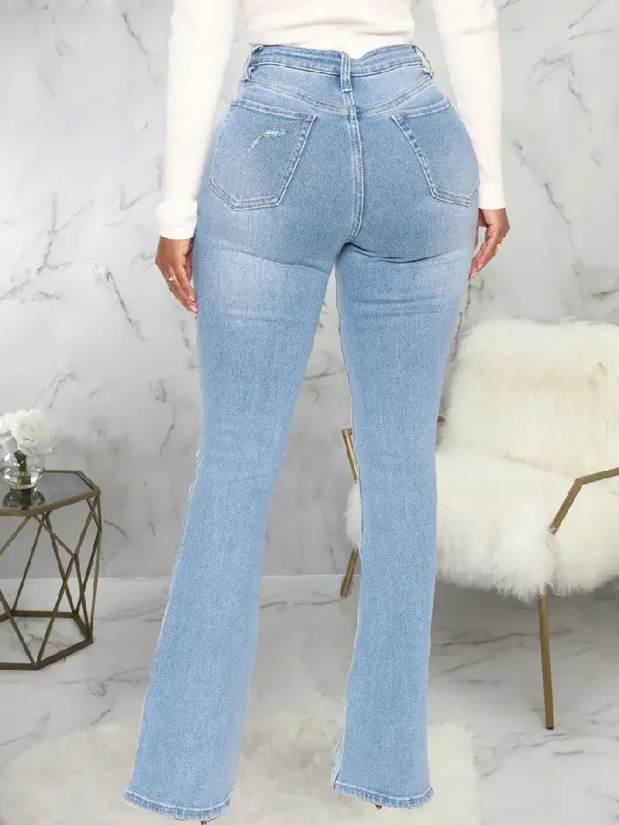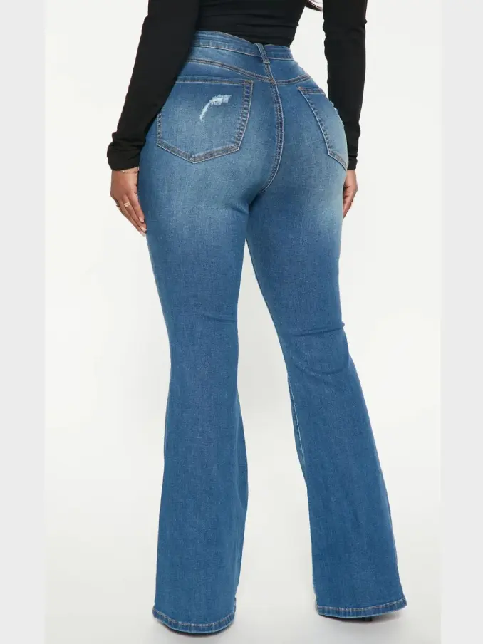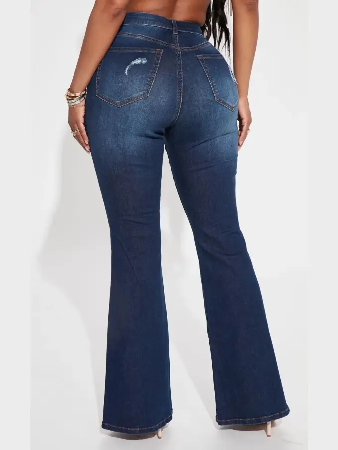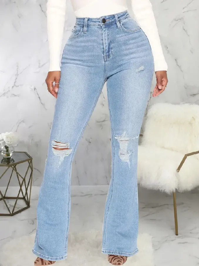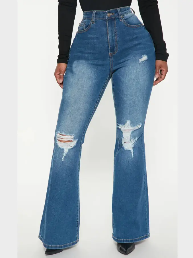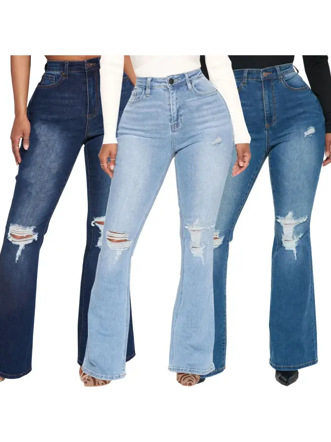 Women Ripped Wide Leg Flare Jeans Denim Trousers Vintage Bell Bottom High Waist Pants