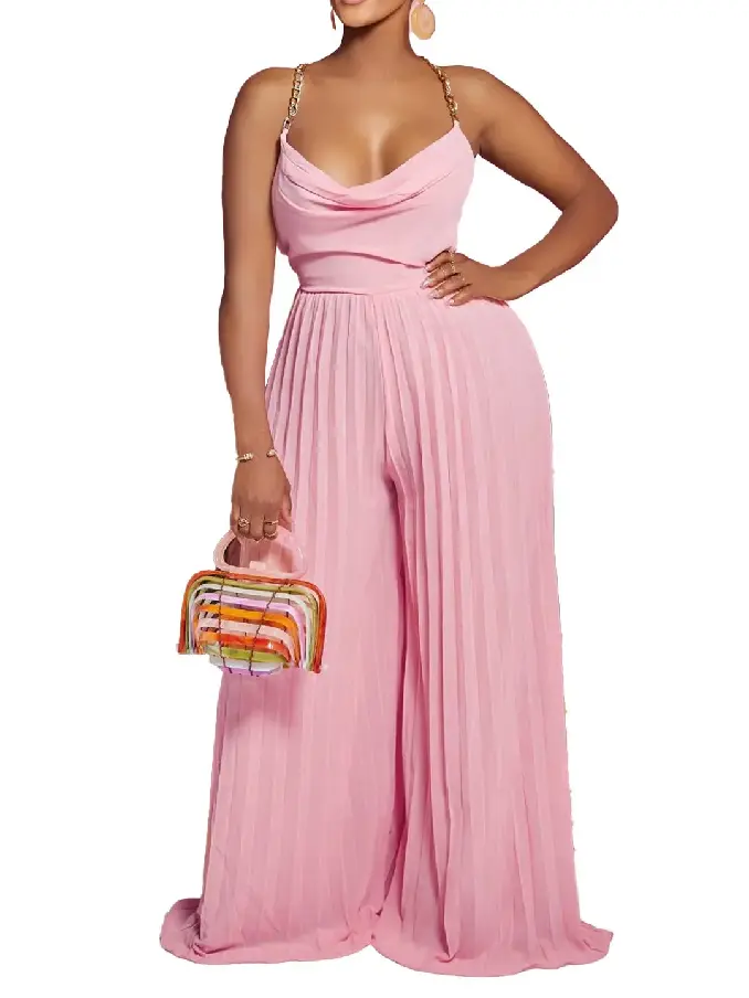 Chain Halter High Waist Backless Wide Leg Pleated Jumpsuit