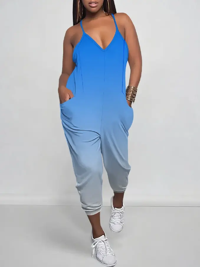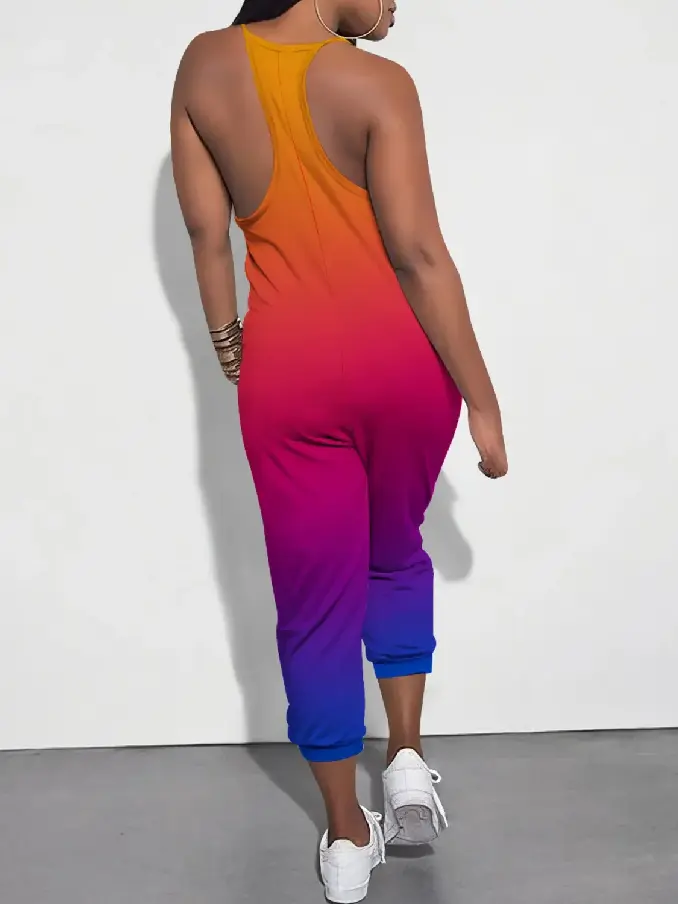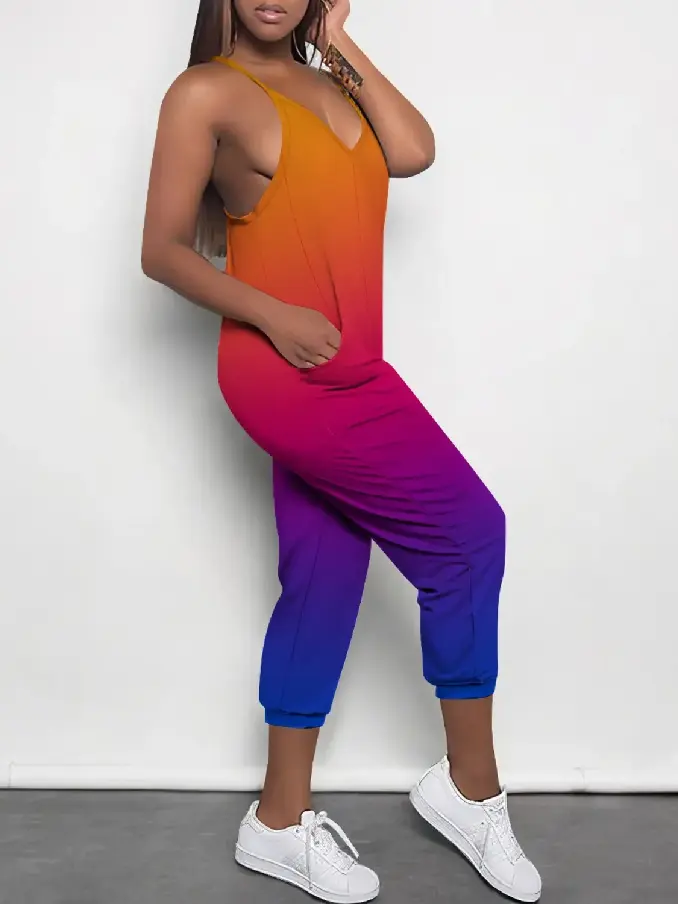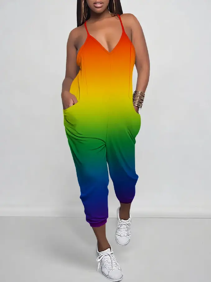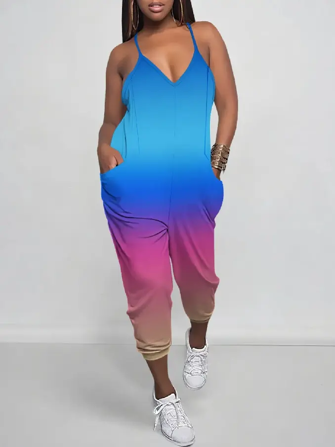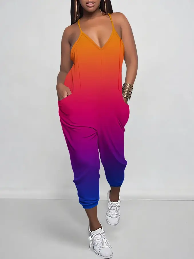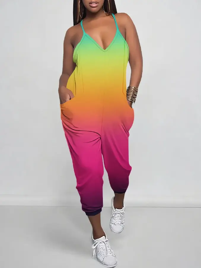 Step into the spotlight with our Gradient Color Print Straps One-Piece Jumpsuit—a bold and vibrant choice for fashion-forward individuals who love to stand out. This eye-catching jumpsuit combines a playful gradient print with modern design elements to create a look that is both chic and contemporary.