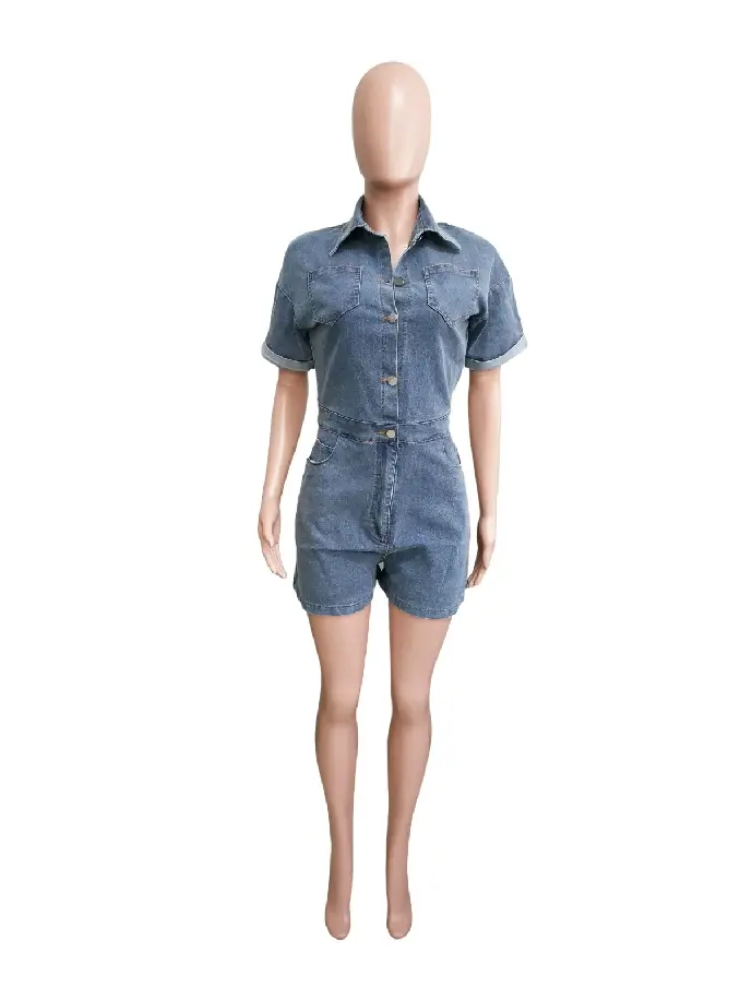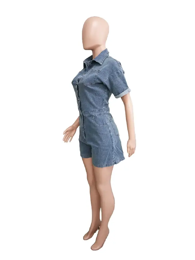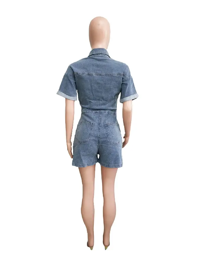 High Elastic Short Sleeve Loose Washed Denim Romper