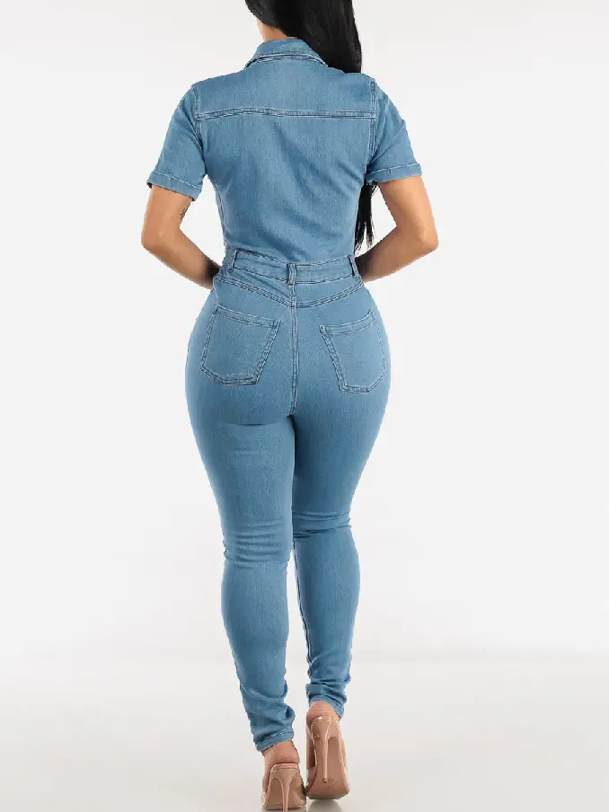 Fashion Slim Short Sleeve Denim Jumpsuit