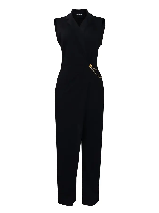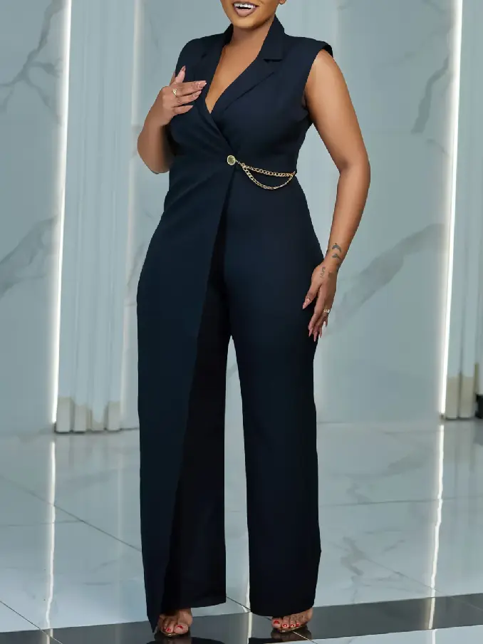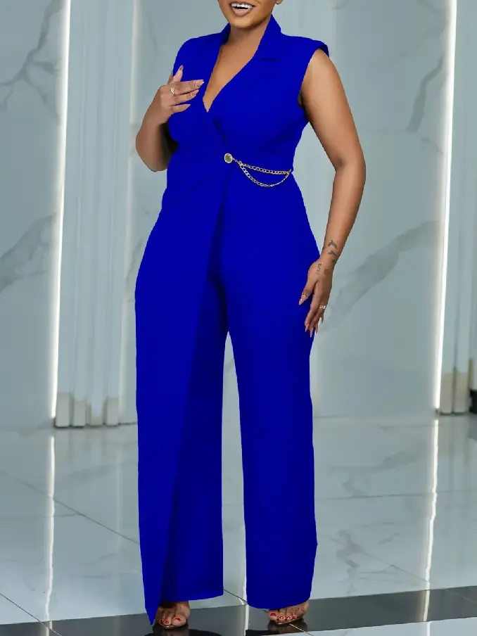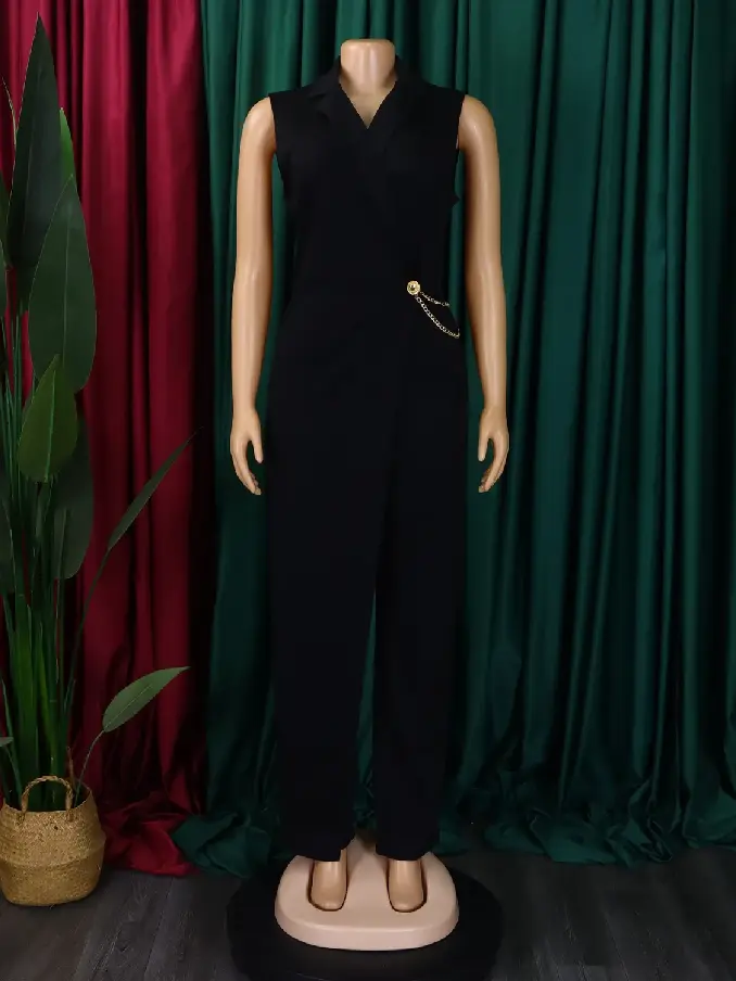 Embrace effortless sophistication with our Plain Sleeveless Waist Chain Lapel African Wrapped Straight Leg Jumpsuit. This versatile piece seamlessly combines contemporary design with a touch of African-inspired elegance, making it a standout addition to any wardrobe.