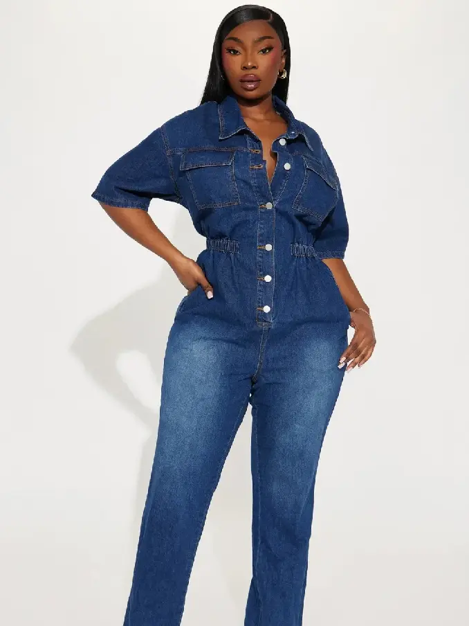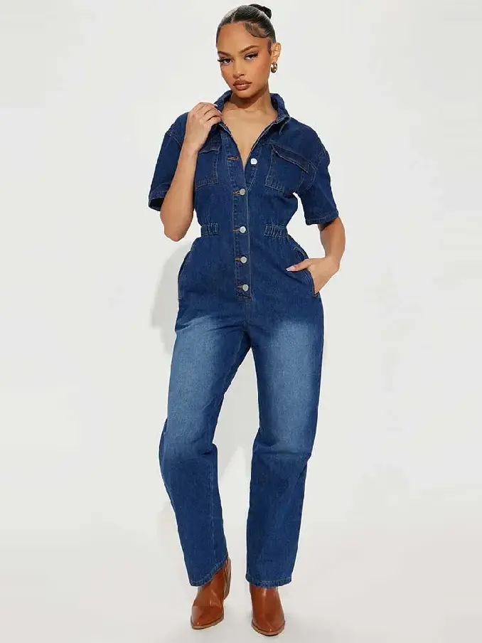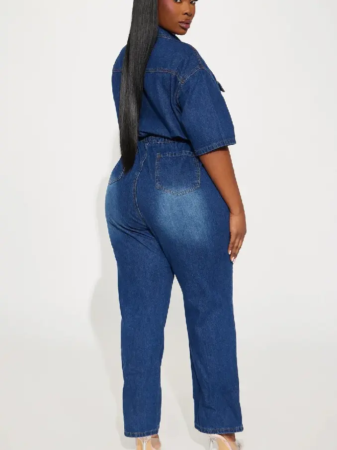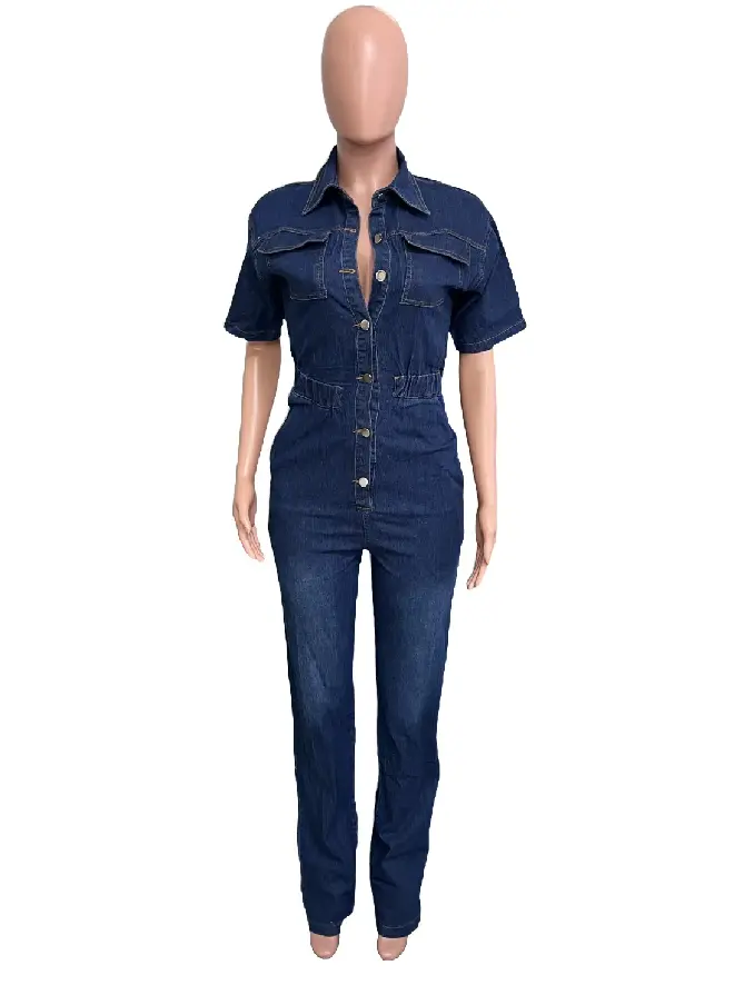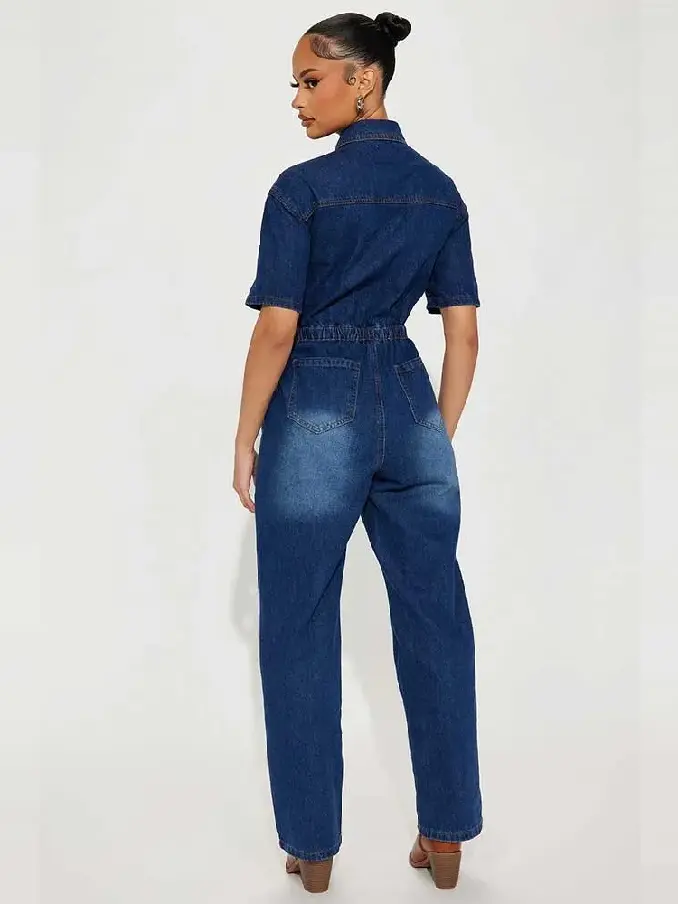 Upgrade your style with our Slim Elastic Short Sleeve Skinny Washed Denim Jumpsuit. Designed to offer a figure-flattering fit and modern flair, this jumpsuit is the perfect blend of comfort and sophistication for any fashion-forward wardrobe.