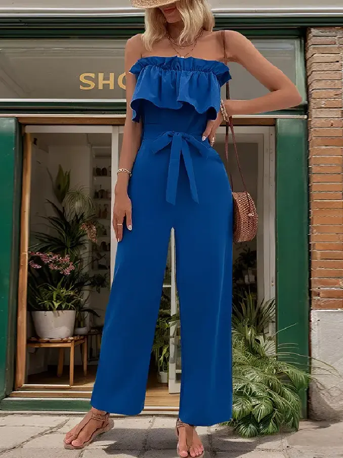 Step into effortless sophistication with our Solid Color Strapless Ruched Jumpsuit. This chic and versatile piece combines a sleek silhouette with modern details, making it a must-have for any stylish wardrobe.