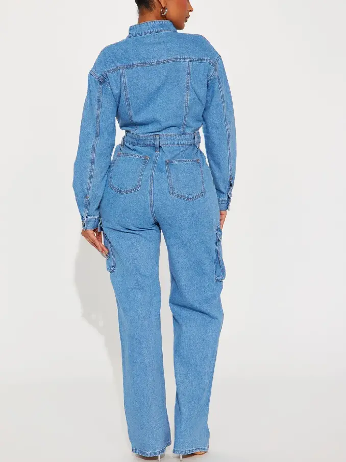 Step Back Washed Bell Bottom Denim Jumpsuit - Light Wash