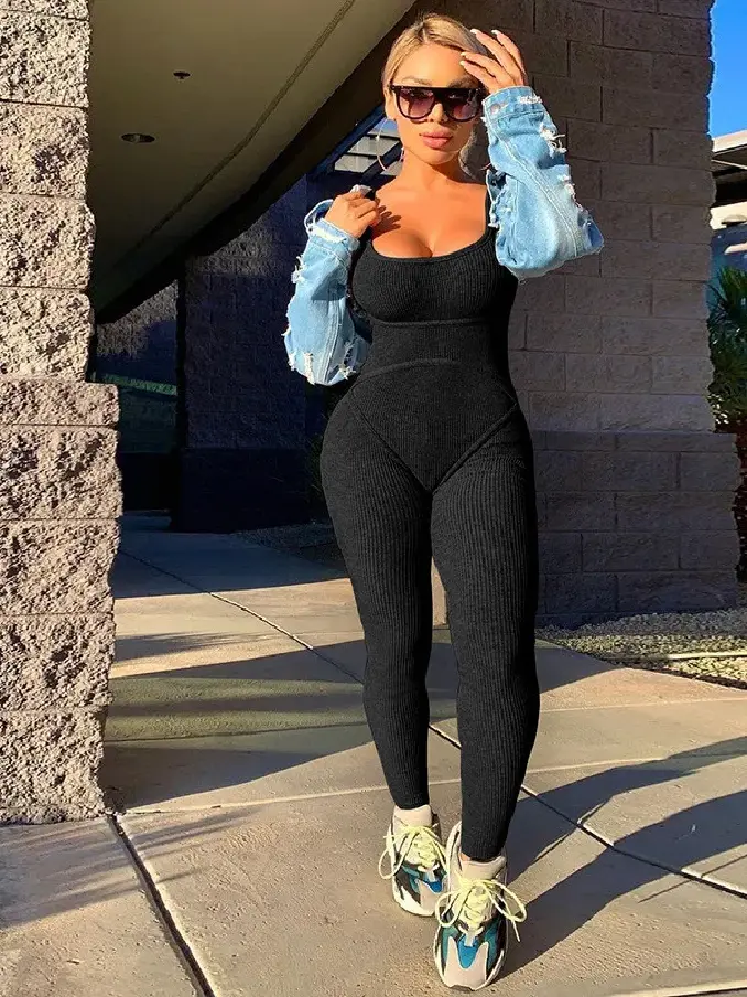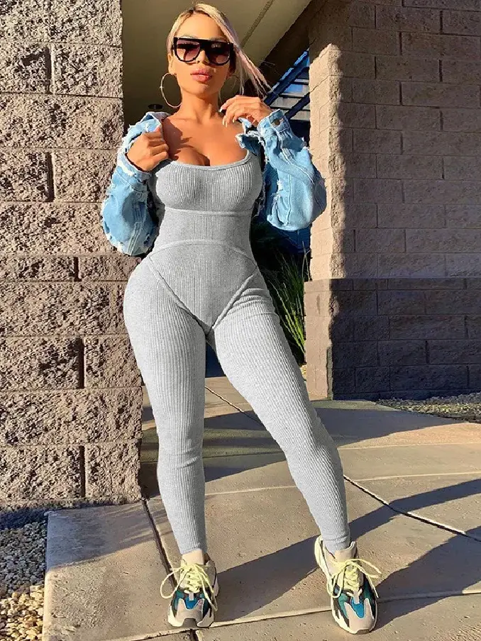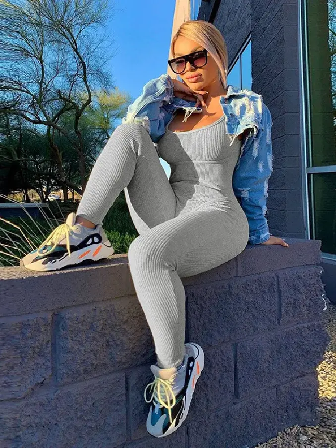 Women's Knitted Ribbed Spaghetti Strap Unitard Jumpsuit