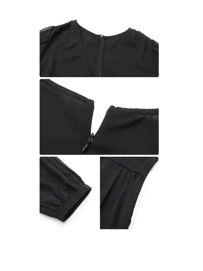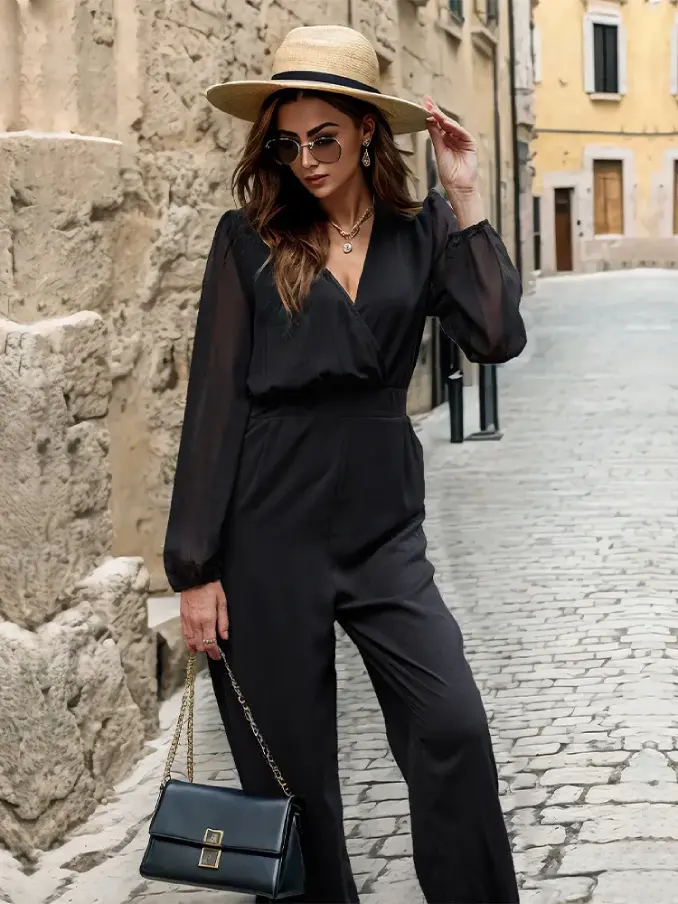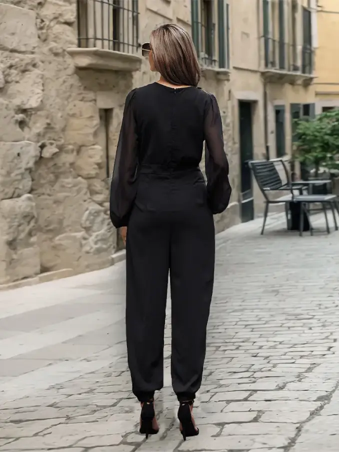Make a bold fashion statement with our Contrast Mesh Lantern Sleeve Overlap Collar Jumpsuit. This eye-catching jumpsuit blends contemporary design with elegant details, creating a standout piece that's perfect for any occasion where you want to turn heads.