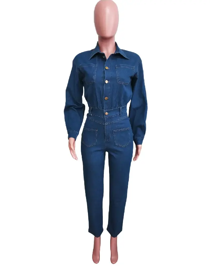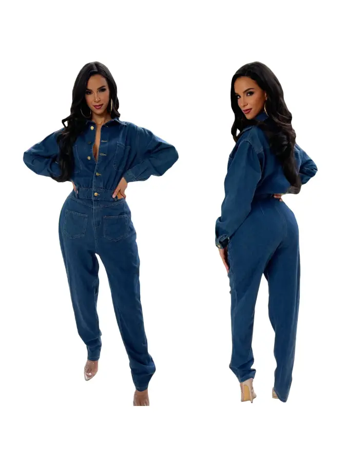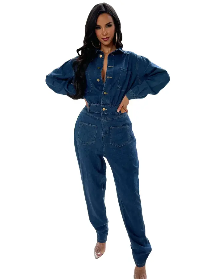 Elevate your everyday style with our Stretch Calf Cuff Washed Denim Jumpsuit. Designed for the modern woman who values both comfort and fashion, this jumpsuit offers a flattering fit and a relaxed vibe with its trendy calf cuffs and classic washed denim look.