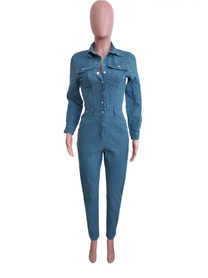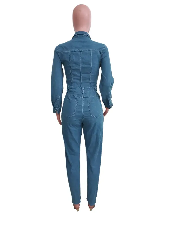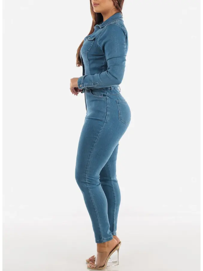 Womens Juniors Denim Long Sleeve Button Up Jumpsuit - Washed Denim Jeans Jumper