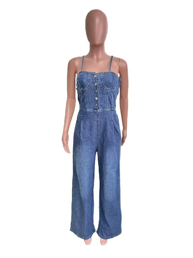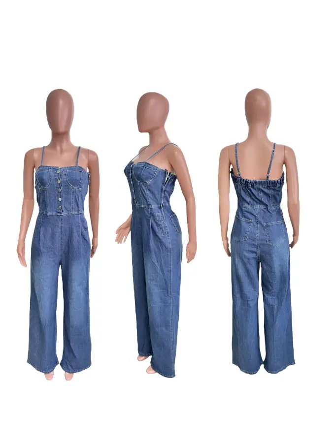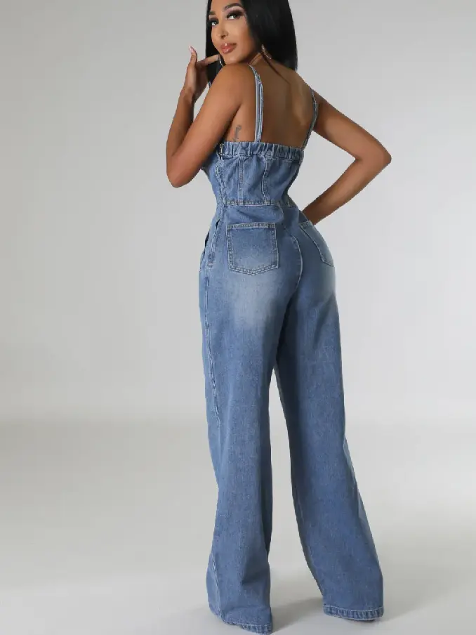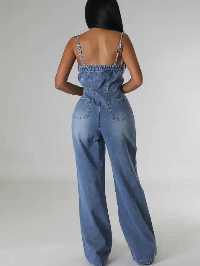 Casual Wide Leg Pants Sexy Straps Denim Jumpsuit