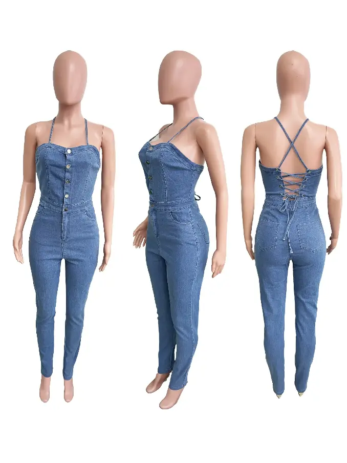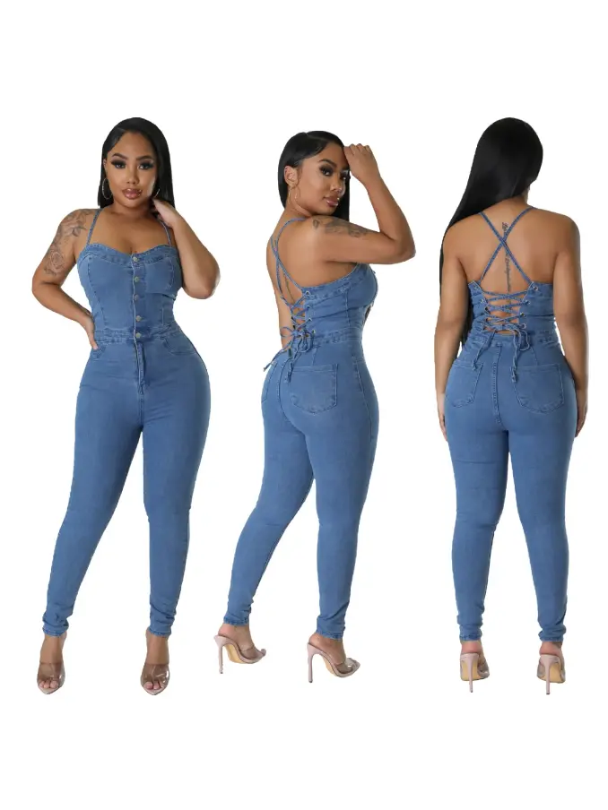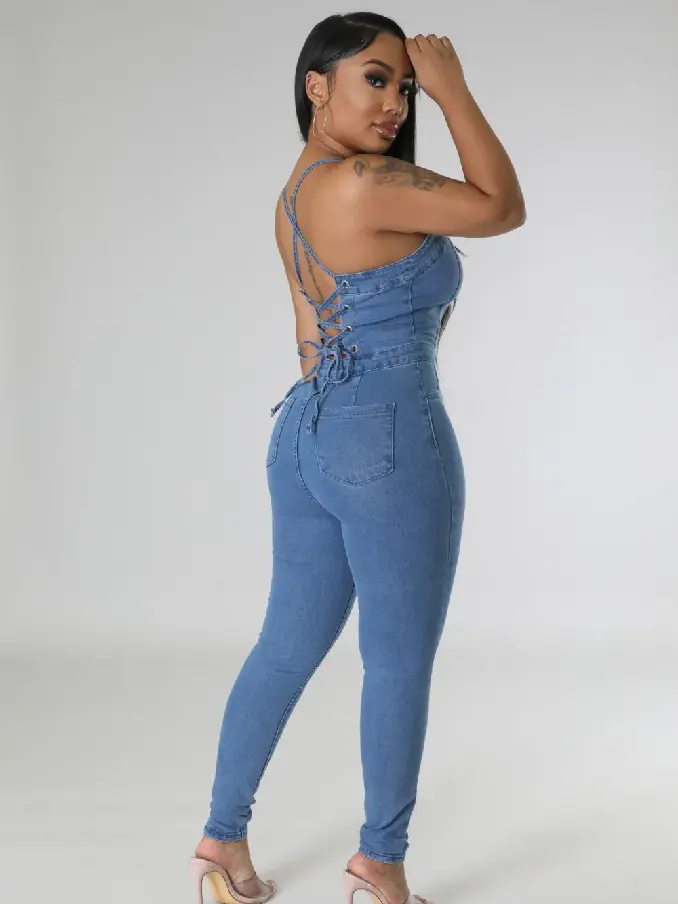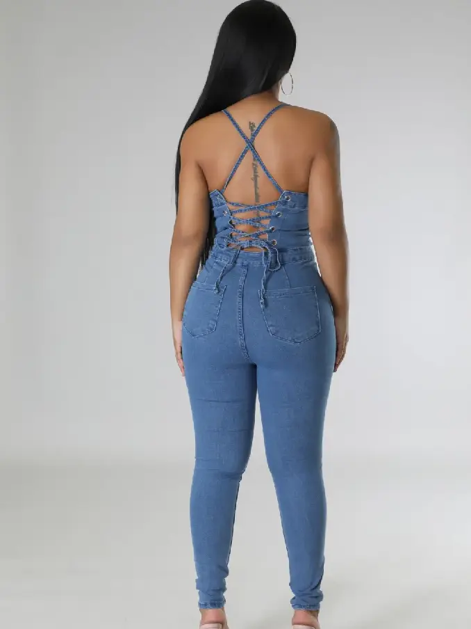 Casual Fashion Skinny Slim Backless Bandage Eyelet Denim Jumpsuit
