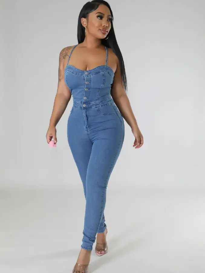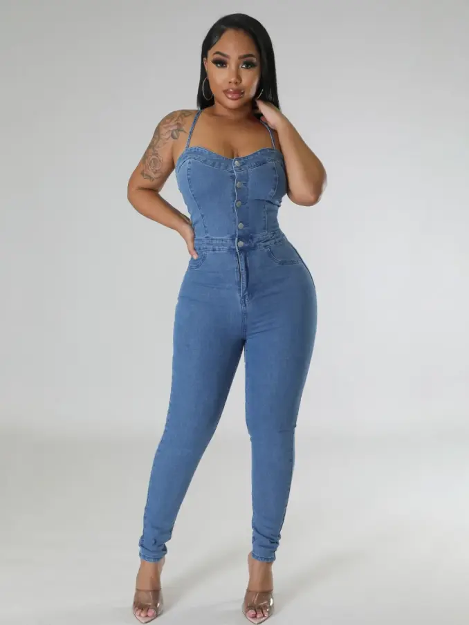 Elevate your casual wardrobe with the Casual Fashion Skinny Slim Backless Bandage Eyelet Denim Jumpsuit. This striking piece combines contemporary design with edgy details to create a look that’s both chic and playful, perfect for a variety of occasions.