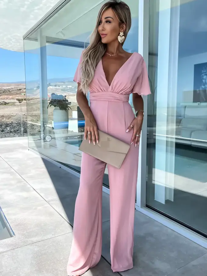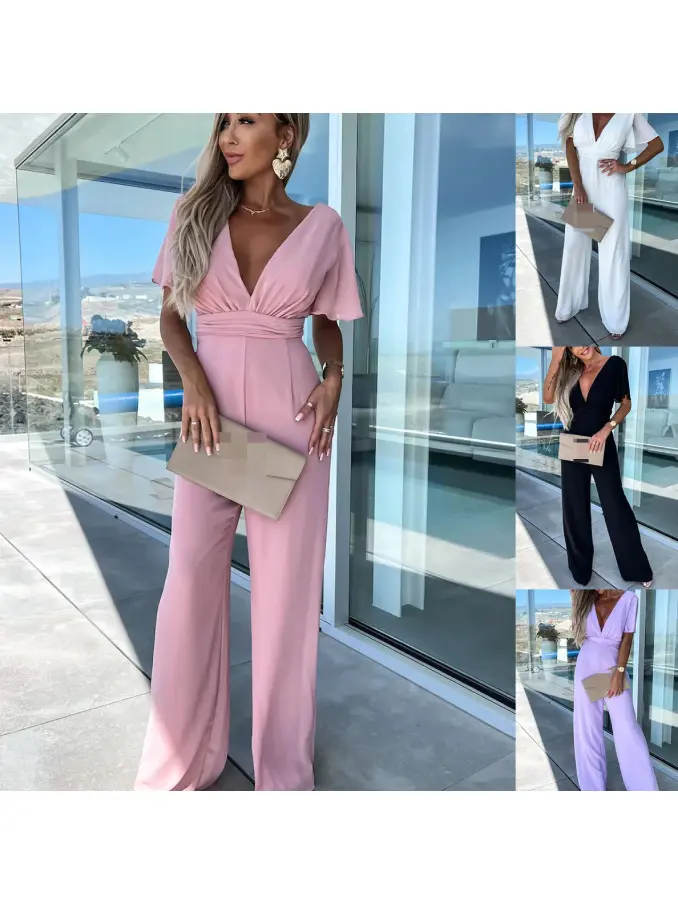 Embrace laid-back sophistication with our V-Neck Chiffon Casual Short Sleeve Loose Vacation Wide Leg Jumpsuit. Perfect for sun-soaked days and stylish getaways, this jumpsuit combines comfort with a touch of elegance for a look that’s both relaxed and refined.