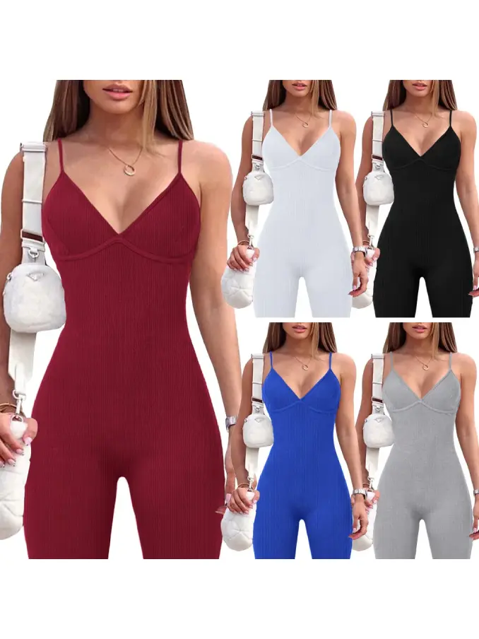 Elevate your activewear with our Solid Color Ribbed Straps Deep V Casual Yoga Jumpsuit, designed for those who value both style and functionality. This jumpsuit combines a sleek, modern look with practical features, making it a versatile addition to your wardrobe.