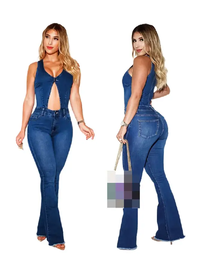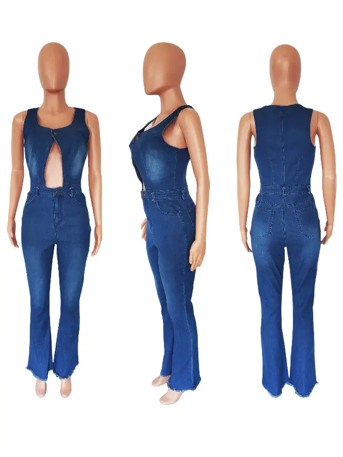 Unleash your style with the Fashion Hollow Slim Sleeveless Denim Jumpsuit, where cutting-edge design meets classic denim. This standout piece features a slim, tailored fit that accentuates your silhouette, while unique hollow detailing adds a modern, fashion-forward edge.
