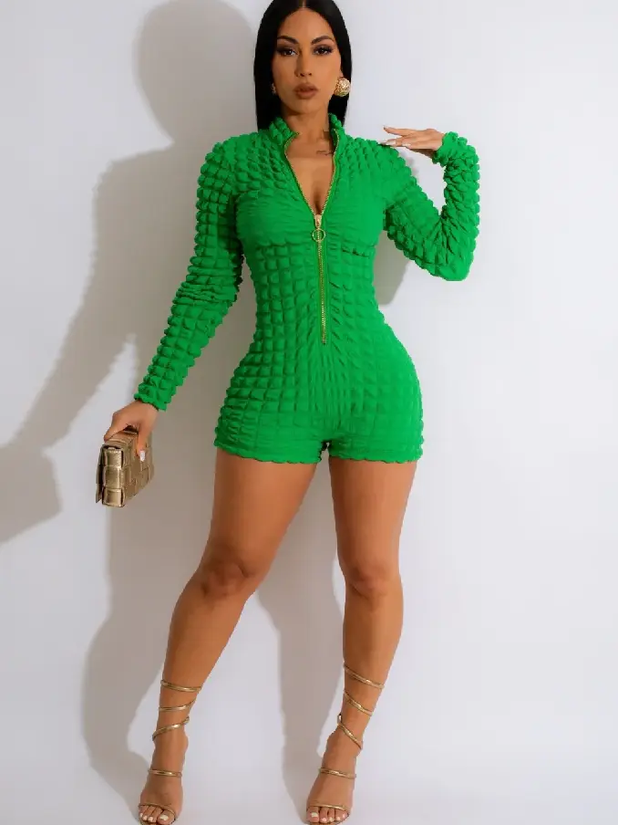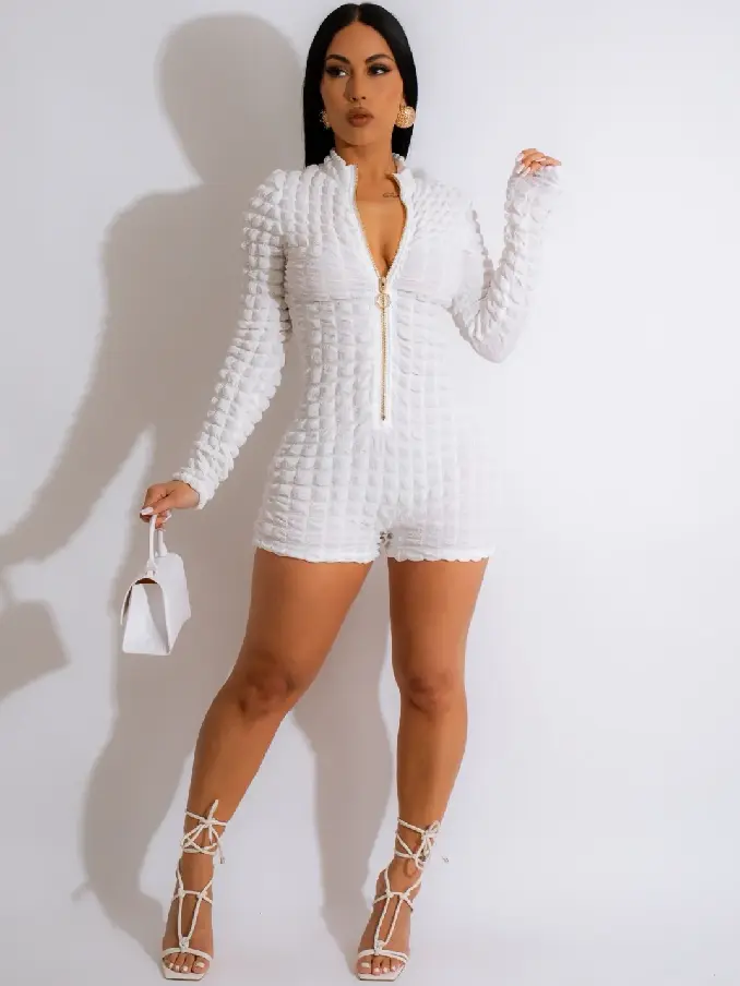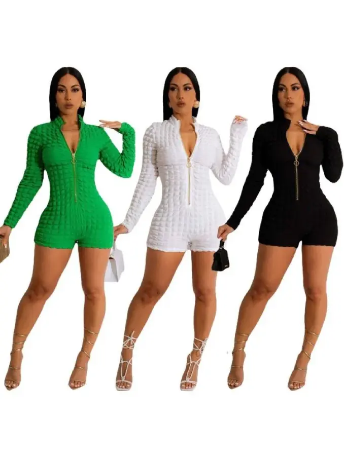 Elevate your casual chic with our Fashion Popcorn Slim Zipper Long Sleeve Romper. This stylish romper combines contemporary design with ultimate comfort, making it a standout choice for your wardrobe.