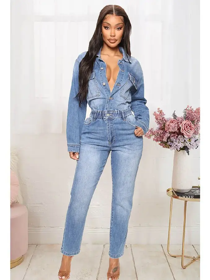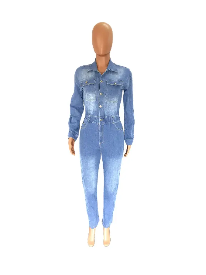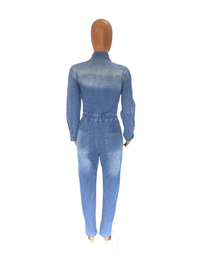Revamp your casual wardrobe with our Slim Fit Washed Denim Jumpsuit with Pockets. This classic piece combines timeless denim with a modern silhouette, offering both style and functionality in one must-have jumpsuit.