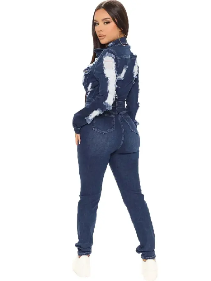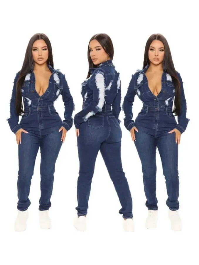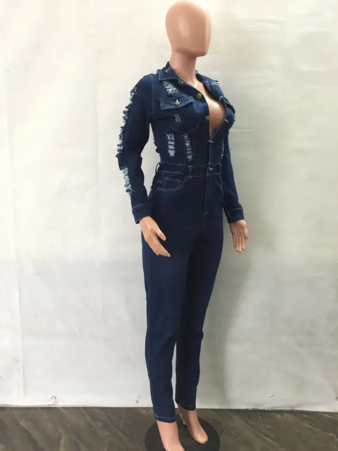 Embrace effortless style with our Fashion Casual Turndown Neck Long Sleeve Denim Ripped Jumpsuit. This trendy piece combines classic denim with contemporary flair, offering a versatile option for both casual and chic outfits.
