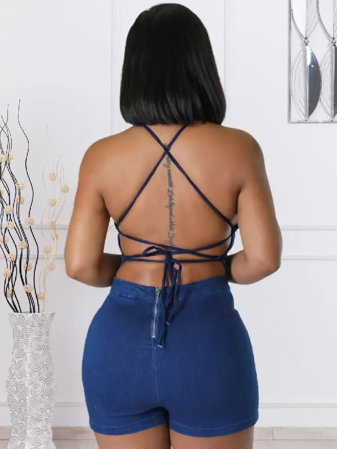 Women's Straps Summer Denim Jumpsuit Backless Zipper Playsuits