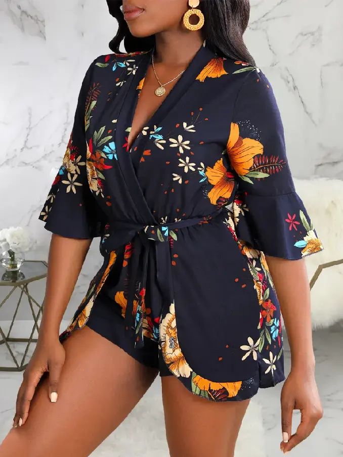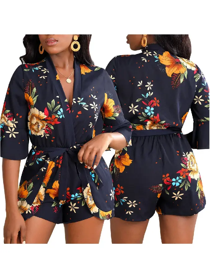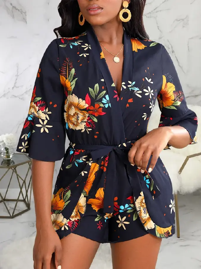 Hot Fashion Plunge Neck Half Sleeve Floral Printed Tie Waist Rompers