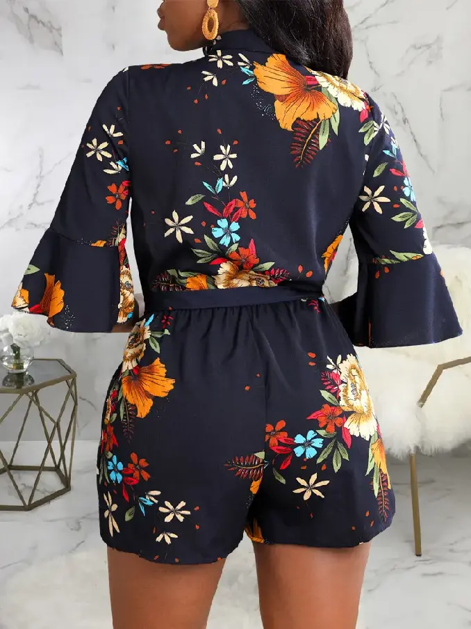 Step into summer with confidence in our Hot Fashion Plunge Neck Half-Sleeve Floral Printed Tie-Waist Romper. This chic romper combines bold floral prints with a flattering design, making it a standout choice for any sunny day or evening event