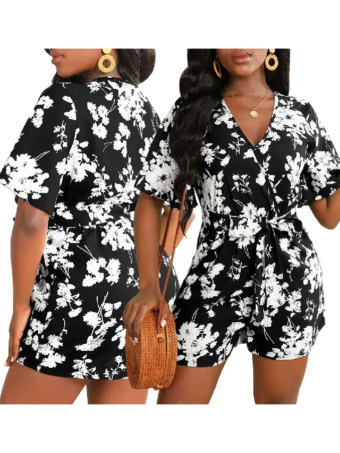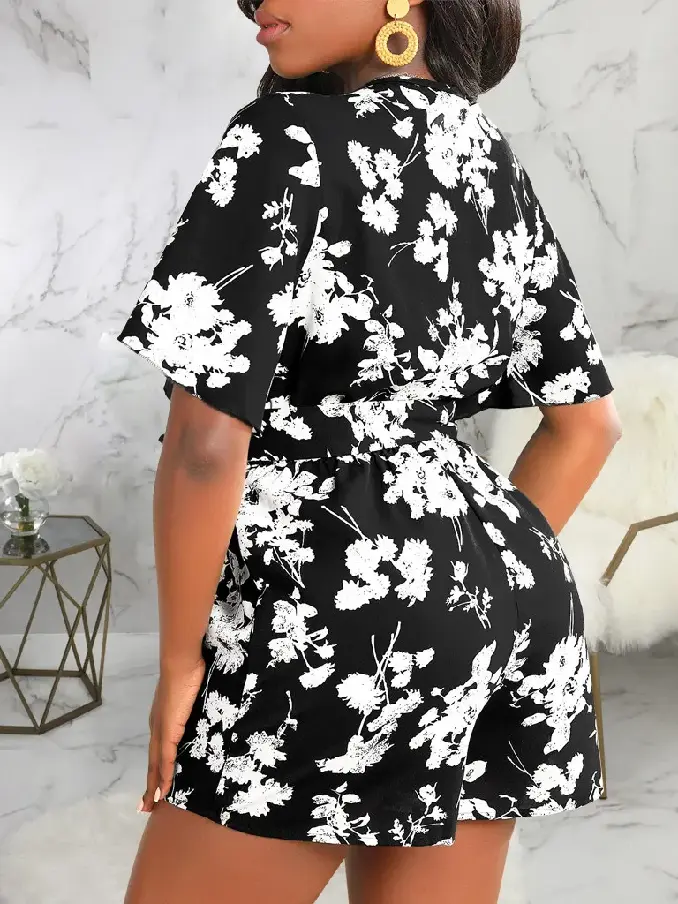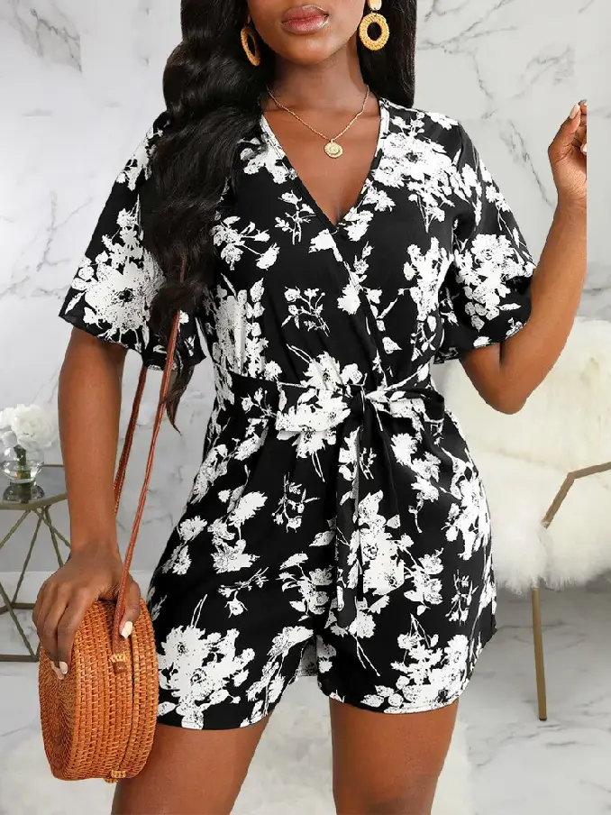 Elevate your style with our Black Belted Floral Print V-Neck Romper, a perfect fusion of sophisticated elegance and playful charm. This romper features a striking floral print against a classic black backdrop, offering a chic and versatile option for various occasions.