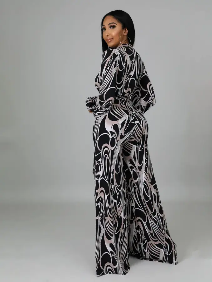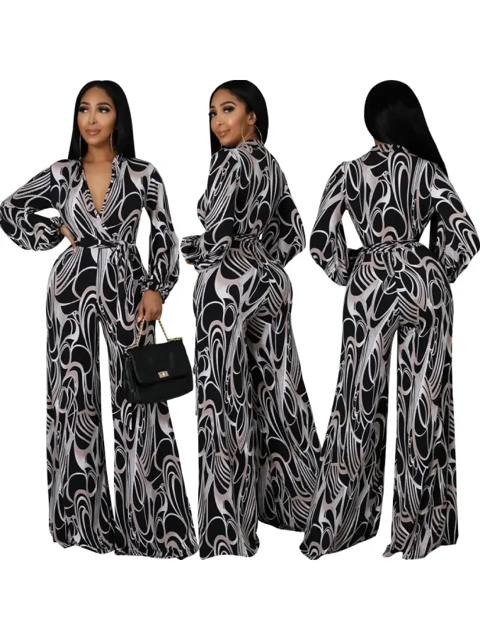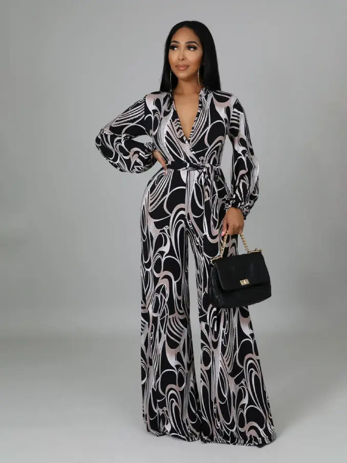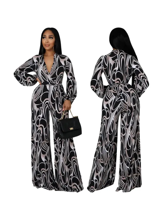 Club Wear Girls Clothing Casual Long Sleeve High Waist V Neck Printed Jumpsuits