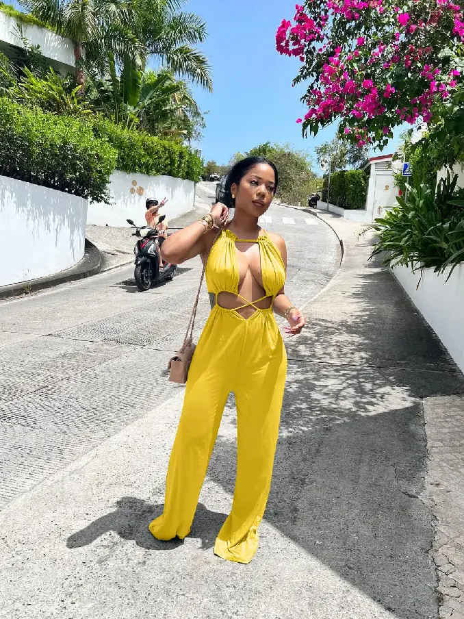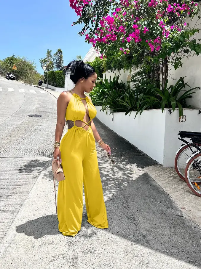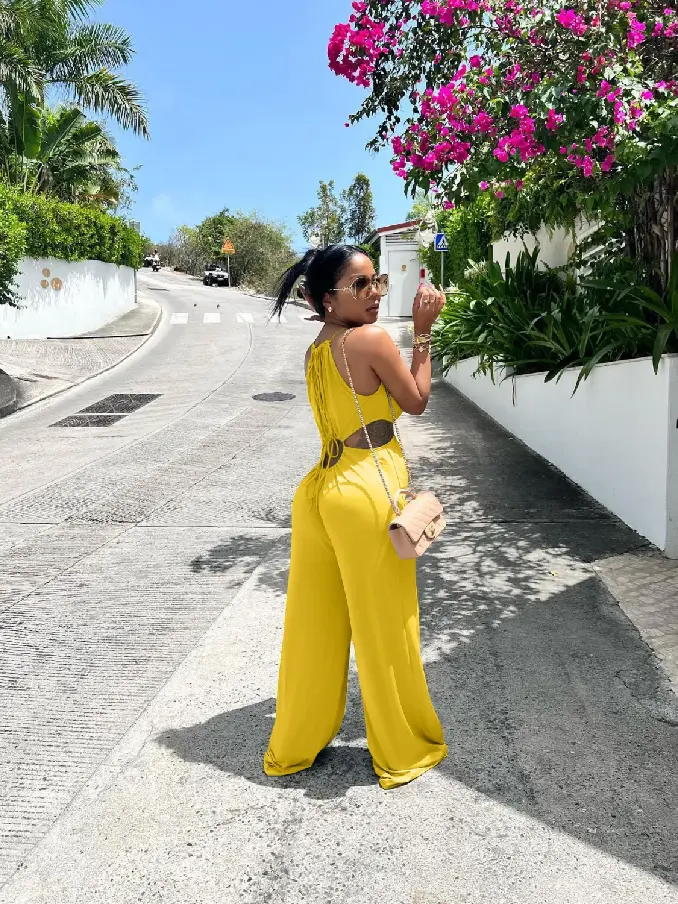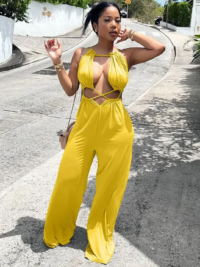 Step out in bold, contemporary fashion with our Yellow Irregular Straps Bandage-Wrapped Wide Leg Jumpsuit. This striking piece combines avant-garde design with a sophisticated silhouette for a look that’s both daring and refined