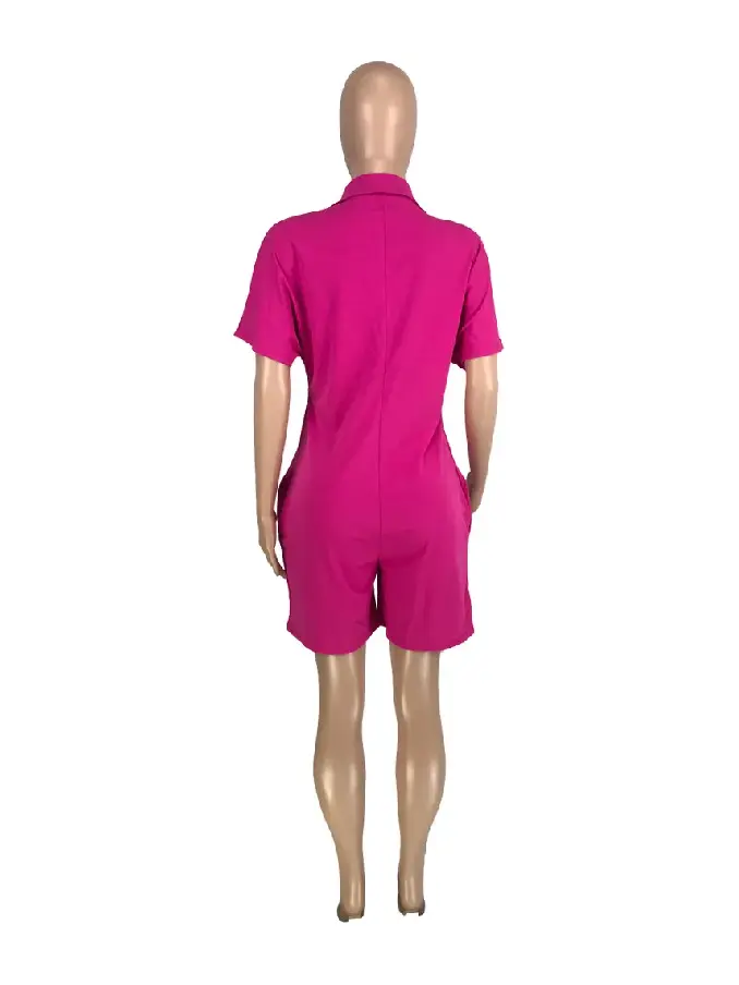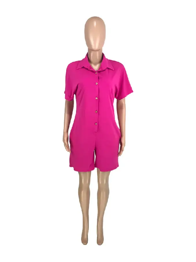 Rose Summer Solid Pocket Buttons Turndown Collar Shorts Bodysuits