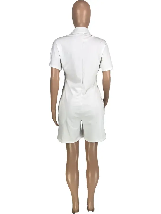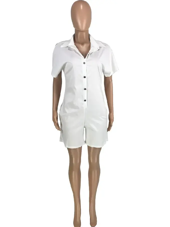 White Summer Solid Pocket Buttons Turndown Collar Shorts Bodysuits