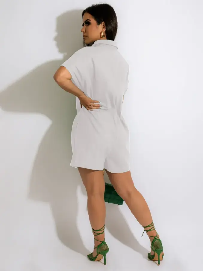 Step into effortless summer elegance with our White Solid Pocket Buttons Turndown Collar Shorts Bodysuit. Designed to blend classic charm with modern functionality, this bodysuit is perfect for a variety of warm-weather occasions