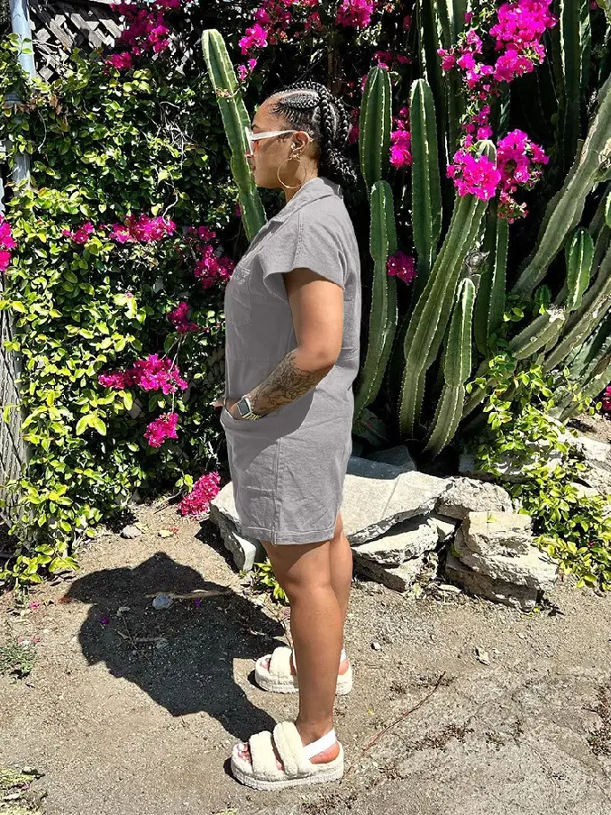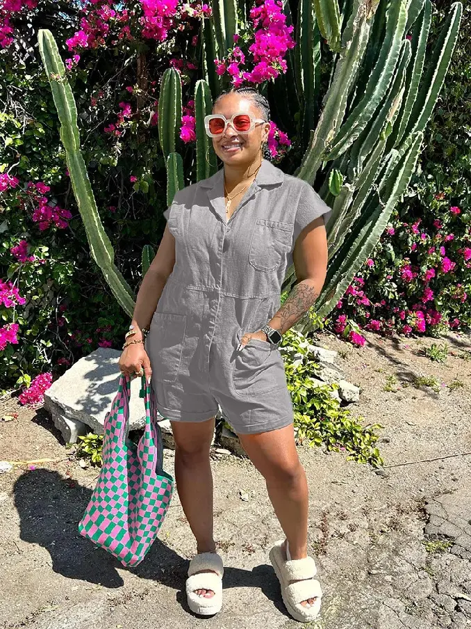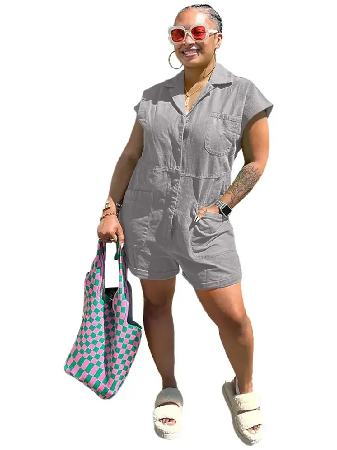 Grey Straight Type Woven Short Sleeve Shorts Rompers with Pockets