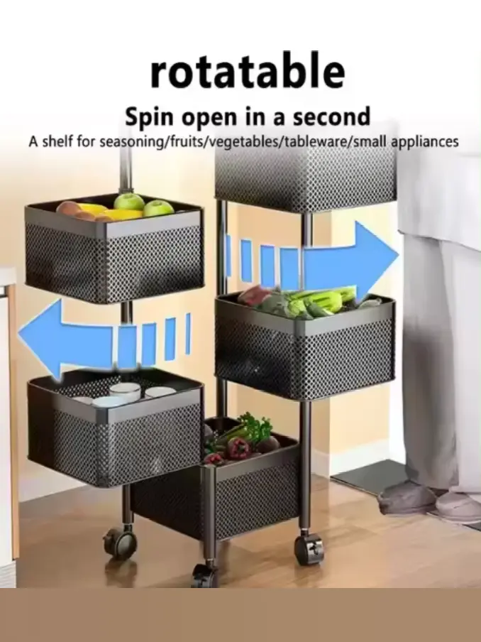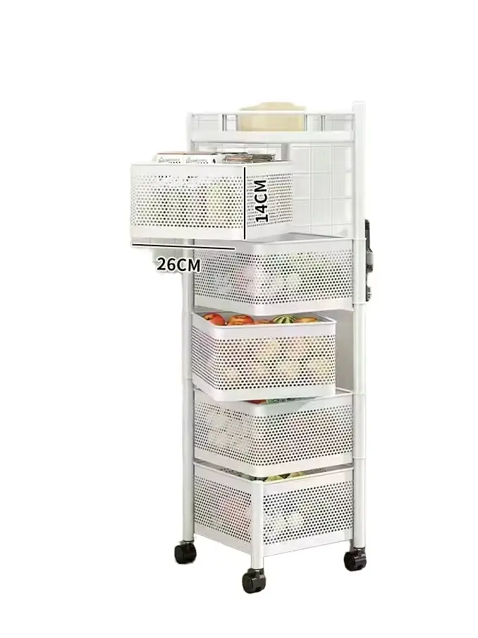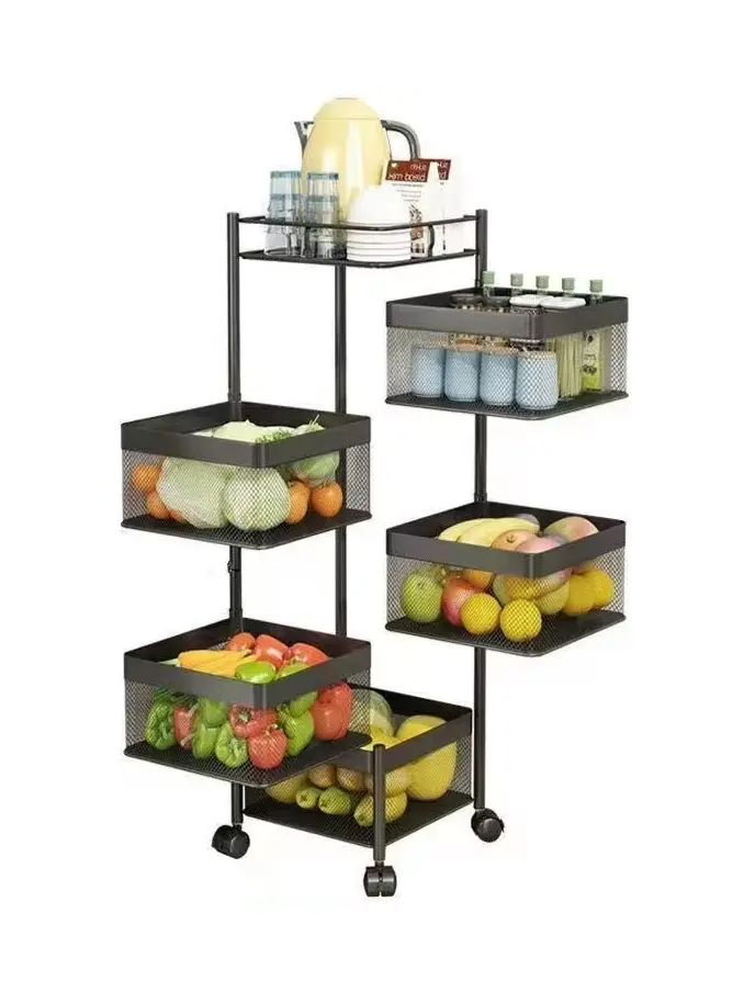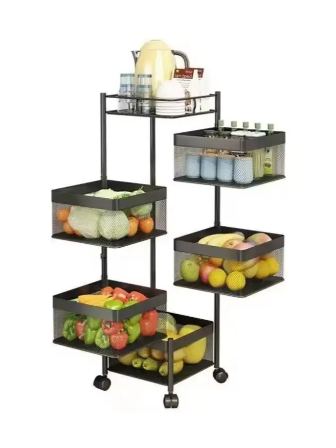 Optimize your kitchen space with the 5-Tier Kitchen Storage Rack Shelf Cart. This sturdy metal rack features rotating fruit baskets, providing ample storage for fruits and vegetables. Equipped with rolling wheels, it’s easy to move and position wherever you need it. Perfect for organizing your kitchen, pantry, or dining area, this versatile storage solution combines functionality with style, helping you keep your produce fresh and accessible.