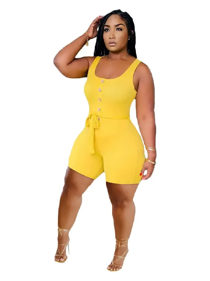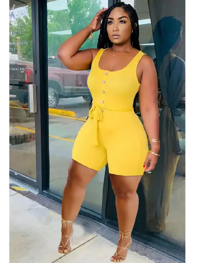 Plus Size Casual Sleeveless Yellow Bodysuits Button Up Front Tie Knot Summer Belted Wide Leg Solid Rompers