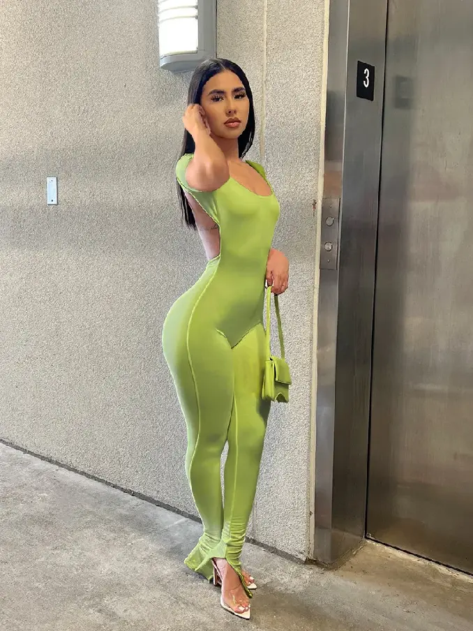 Make a stunning entrance in our Light Olive Green Solid Color Backless Slit Flare Jumpsuit. This sophisticated piece is designed to blend classic elegance with modern allure