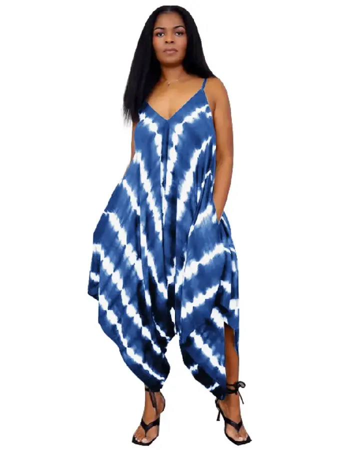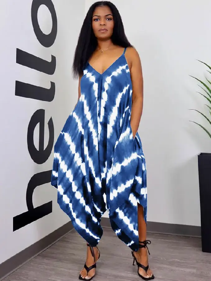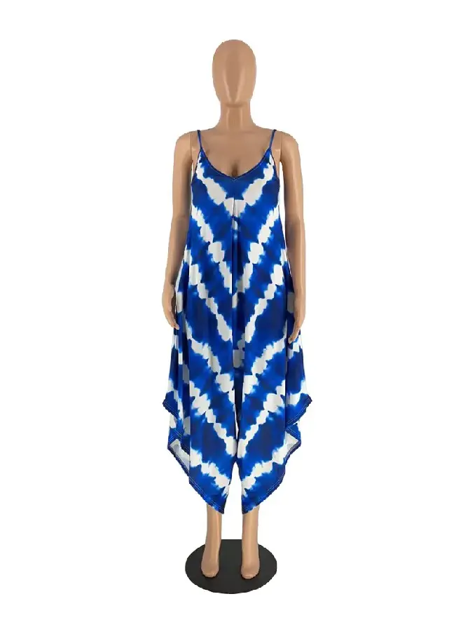 Embrace effortless style with our Casual Print Split Joint Spaghetti Strap Sleeveless Loose Jumpsuit. Designed for relaxed comfort and eye-catching appeal.