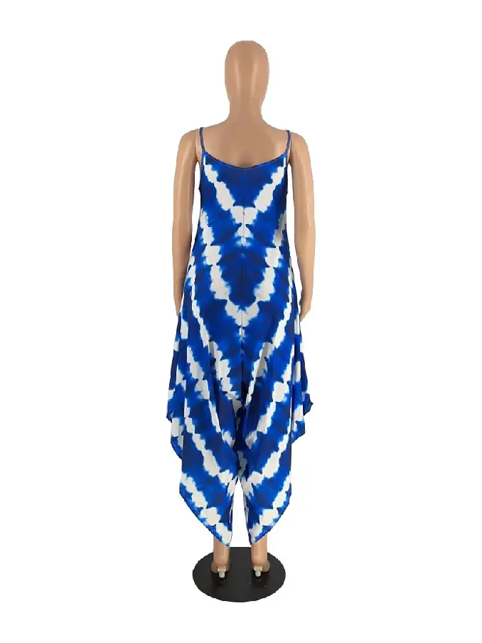 Casual Print Split Joint Spaghetti Strap Sleeveless Loose Blue Jumpsuits