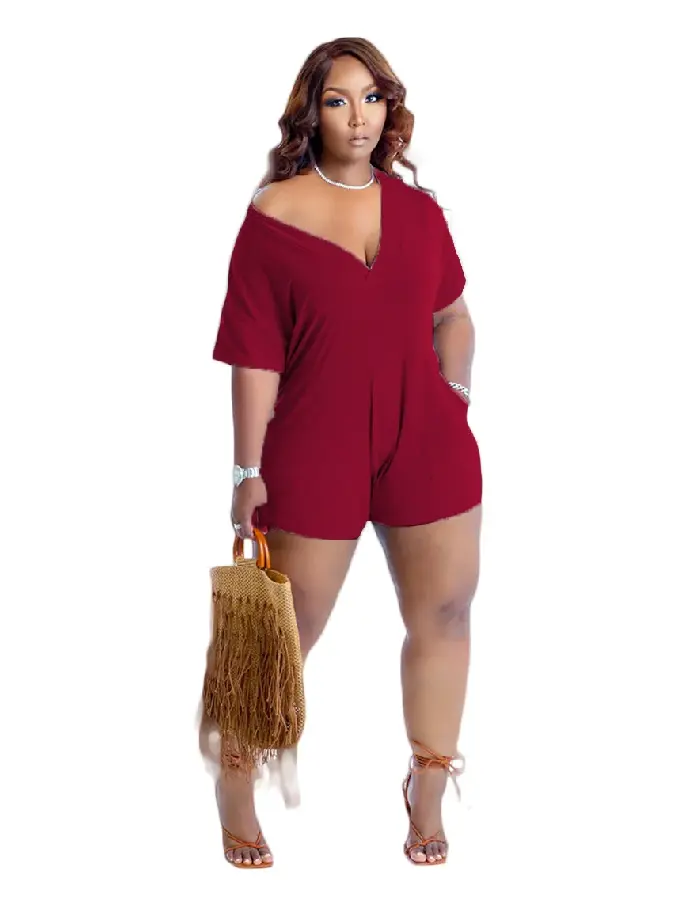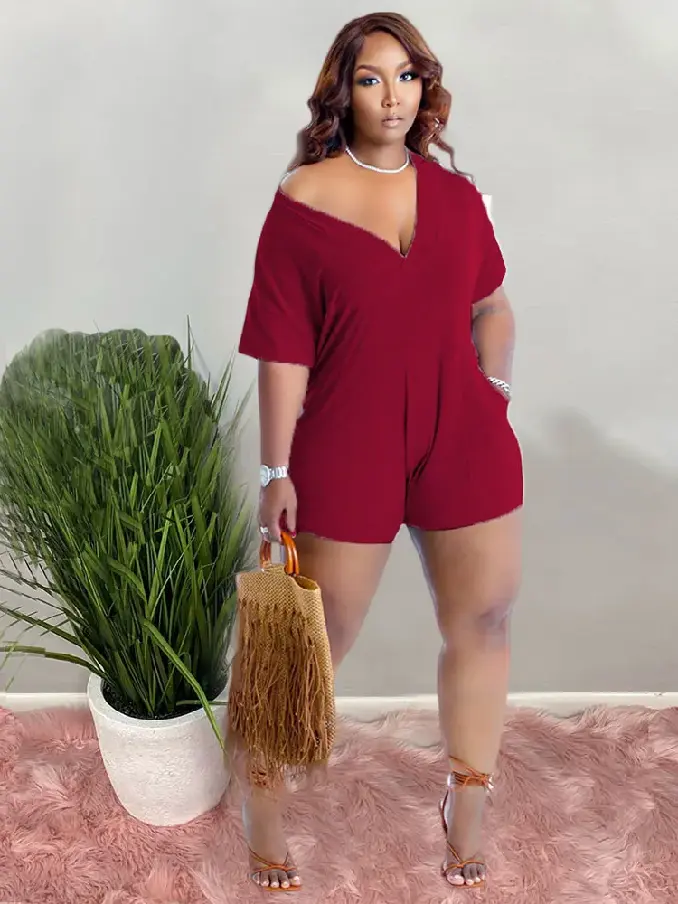 Step into the spotlight with our Wine Red Nightclub Clothes 2022 Summer Solid V-Neck Romper with Pockets. Designed to make a bold statement.