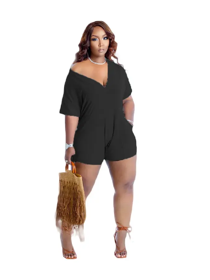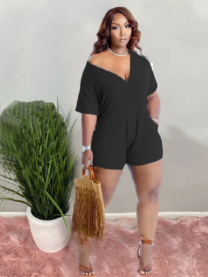 Elevate your summer nightlife with our Black Nightclub Clothes 2022 Summer Solid V-Neck Romper with Pockets. This chic and versatile romper is designed to make a statement.