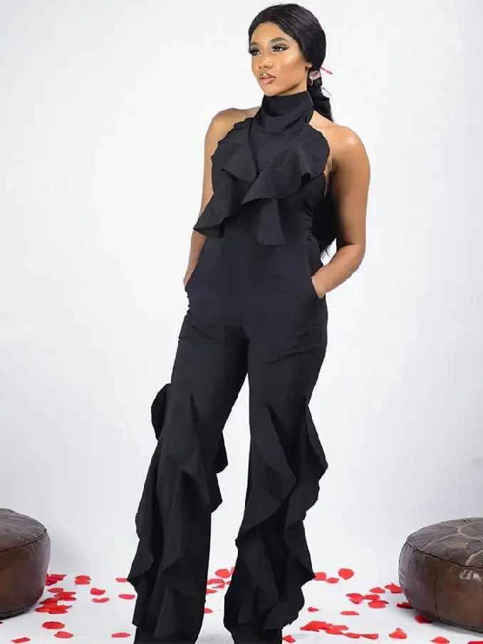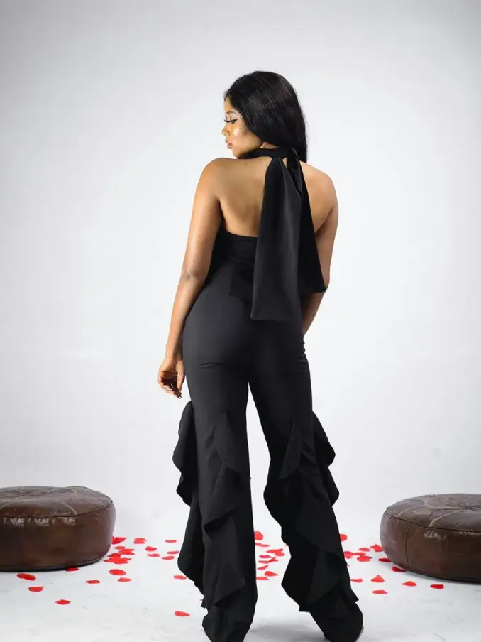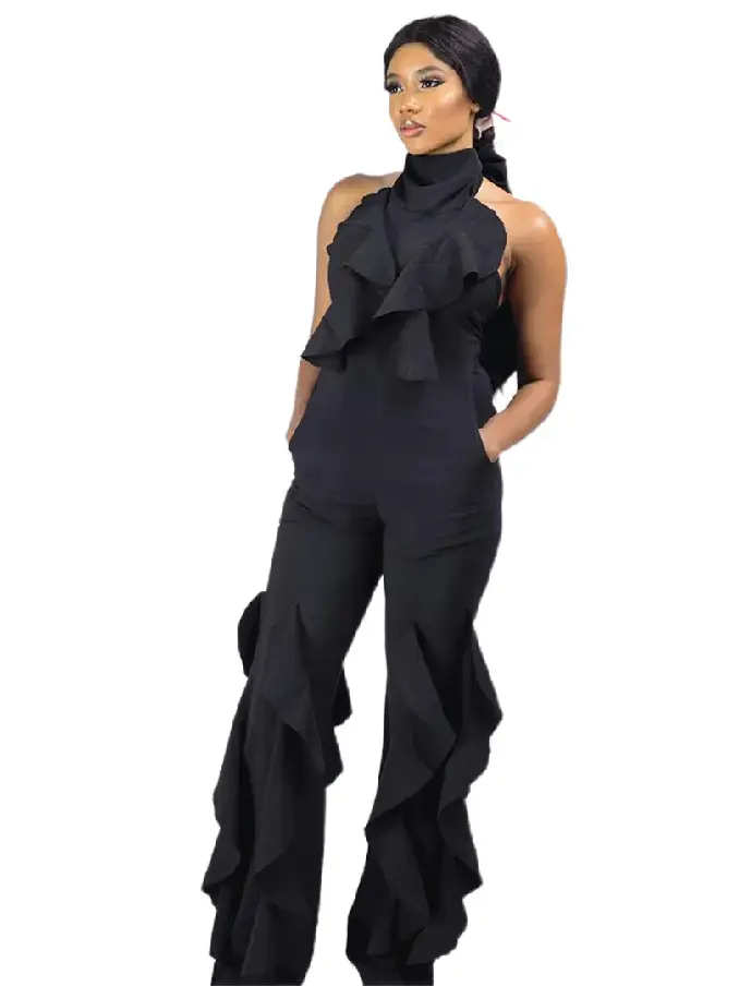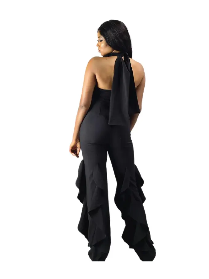 Step into effortless elegance with our Black Open Back Sleeveless Ruffle Jumpsuit with Wide Leg. This sophisticated piece combines modern design with timeless charm, making it the perfect choice for any upscale event or special occasion.